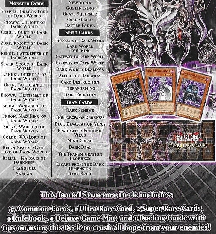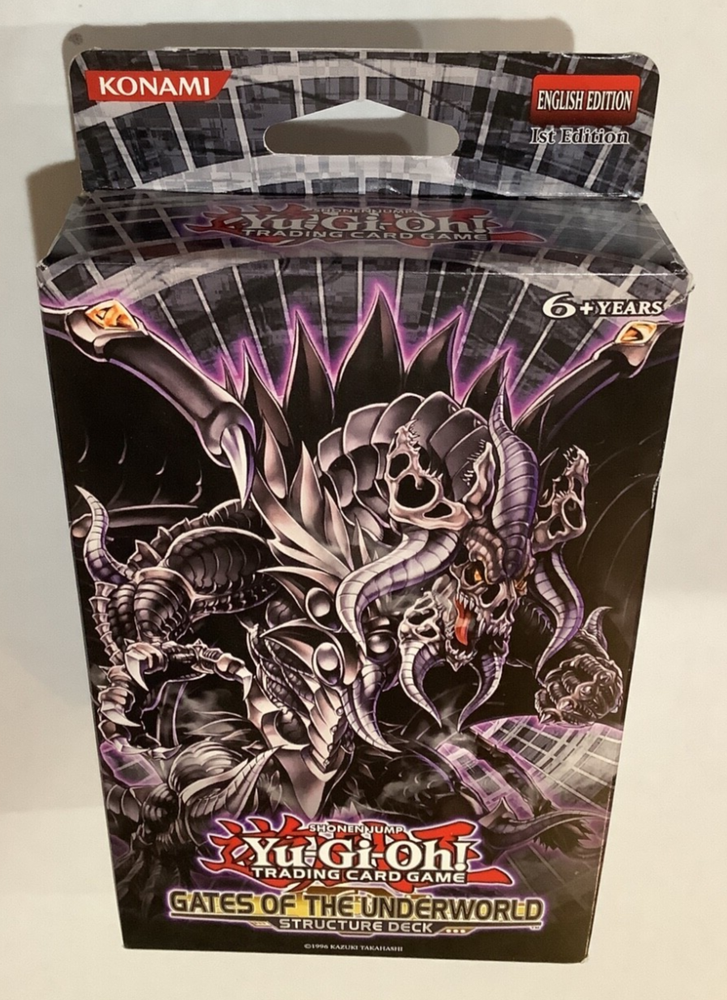 **** Yu-Gi-Oh! **** ** GATES OF THE UNDERWORLD ** *** Konami ** First Edition *** ** English * * Structure Deck ** ******************************* USPS Tracking is included with all domestic shipments. Insurance included with all domestic shipments! ******************************* This eBay listing is for one Yu-Gi-Oh! GATES OF THE UNDERWORLD * Structure Deck. It was produced, manufactured, and distributed by Konami. It is factory-sealed, first edition and in the English Language. I've given you scans and/or photos in the eBay viewer above so that you can see the condition of my merchandise. I'm showing all sides of the box. The images are of the actual Structure Deck that I'm offering on eBay. I don't do pre-orders or pre-sales on items that I don't physically have. All eBay listings are for merchandise that is in stock and ready to ship! I don't use stock images or crop the edges of the scanned items. I want everything clearly visible so you can get an excellent view of the items that I'm selling. The upper right, front corner, and the upper flap that has the triangle cut-out (to hang the deck on a display) has some light surface creasing. This won't affect the contents. All images are scanned and/or photographed by me. There might be some glare (not wear) from the images. Of course, we offer a combined shipping discount! Domestic shipping by USPS Ground Advantage is $7.99 for the first CCG Special Edition, and $1.00 for each additional SE, Intro Pack, or Deck shipped with USPS insurance coverage. I also offer a USPS Priority Mail shipping option. USPS Tracking is included with all domestic shipments. ****************************** All items are securely shipped . I bag, pack, and ship all lots with extraordinary care. This item will be surrounded by soft packing materials, protected by thick cardboard, sealed in a plastic bag, wrapped in bubble wrap, and then carefully packed in a shipping container. We make a great effort to protect against damage. As you can see from our feedback, my buyers have been very happy with both the quality of my merchandise and our secure packing. All boxes of booster packs or starter decks, whether shipped domestically or internationally will be shipped in a box. Buy with confidence! No shipping in Envelopes or Mailers! ********************************* Payment has to be made with eBay. and all items must be shipped to the address supplied by eBay. Absolutely no exceptions! This applies to merchandise being shipped either internationally or domestically. ******************************** You can save on shipping by winning more than one of my items selling on eBay! I will combine domestic shipping on all eBay listings won during a 5 day period. Please pay for all the items that you win with one payment rather than separately. When you combine your payments, I'll combine your shipping. If you have any questions, don't hesitate to get in touch with me through eBay. *********************************** INTERNATIONAL BUYERS : Please read this section! All international winners will be shipped by Insured Priority Mail International in a box. I will take care of insurance myself. I don't charge a handling fee. I appreciate international buyers and understand that the shipping cost is very high . You just pay for the postage, and I'll have your item insured for the amount of the purchase price. If you want to use some other shipping method, Please Don't Buy this item! I realize that there are less expensive, yet slower ways of shipping, but I'm not looking for problems. I simply want to ensure that your items reach you securely. You can't insure these other shipping methods. so there is no less costly option that is suitable. If you are buying inexpensive lots in some cases, the shipping charge might be more than the winning bid. Sorry if the shipping fees seem high, but they are what the USPS charges for a Priority Mail International package of this weight. Every international package that I ship will be fully insured for the amount the item sold for. Payment from winning international buyers must be through eBay (or PayPal in the form of an instant payment from a PayPal balance.) No PayPal payments from Foreign Checking Accounts or Foreign Credit Cards. SORRY, NO EXCEPTIONS !!! Remember, all items must be shipped to the confirmed address supplied by eBay! Import duties, taxes, and charges are not included in the item price or shipping charges. These charges are the buyer's responsibility. Please check with your country's customs office to determine what these additional costs will be before bidding/buying. If extra charges are normally collected by the delivering freight (shipping) company or when you pick the item up, do not confuse them for additional shipping charges. These charges aren't from me. We do not mark merchandise values below value or mark items as "gifts." Both the U.S. and International government regulations prohibit such behavior. Also, that action would affect your shipment receiving proper insurance coverage. International buyers - please contact me through eBay if you have any questions. ****************************** We ship packages Monday through Saturday. We will try to ship the next business day after payment is received, but if many transactions end at the same time, it might take an extra day. Items are shipped in the order in which payment is received. After the shipping label is printed, I'll post your tracking information on eBay as quickly as I can. Payment must be received within 5 days of winning the item on eBay. If you have special circumstances, let me know, and I will try to accommodate you. EBay will send an invoice to all winners after the listing's completion. If you win more items, I'll update the invoice. I reserve the right to refuse to sell to buyers with a poor feedback history. ************************************ I do not hold feedback "hostage." I always post positive feedback on successfully completed eBay transa