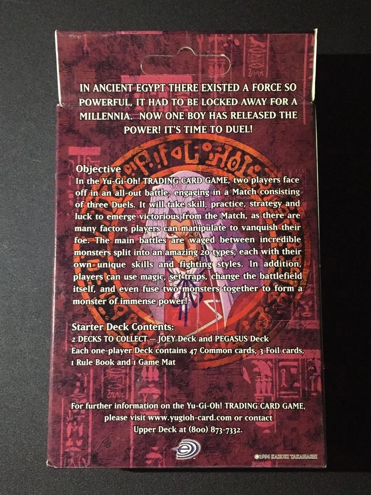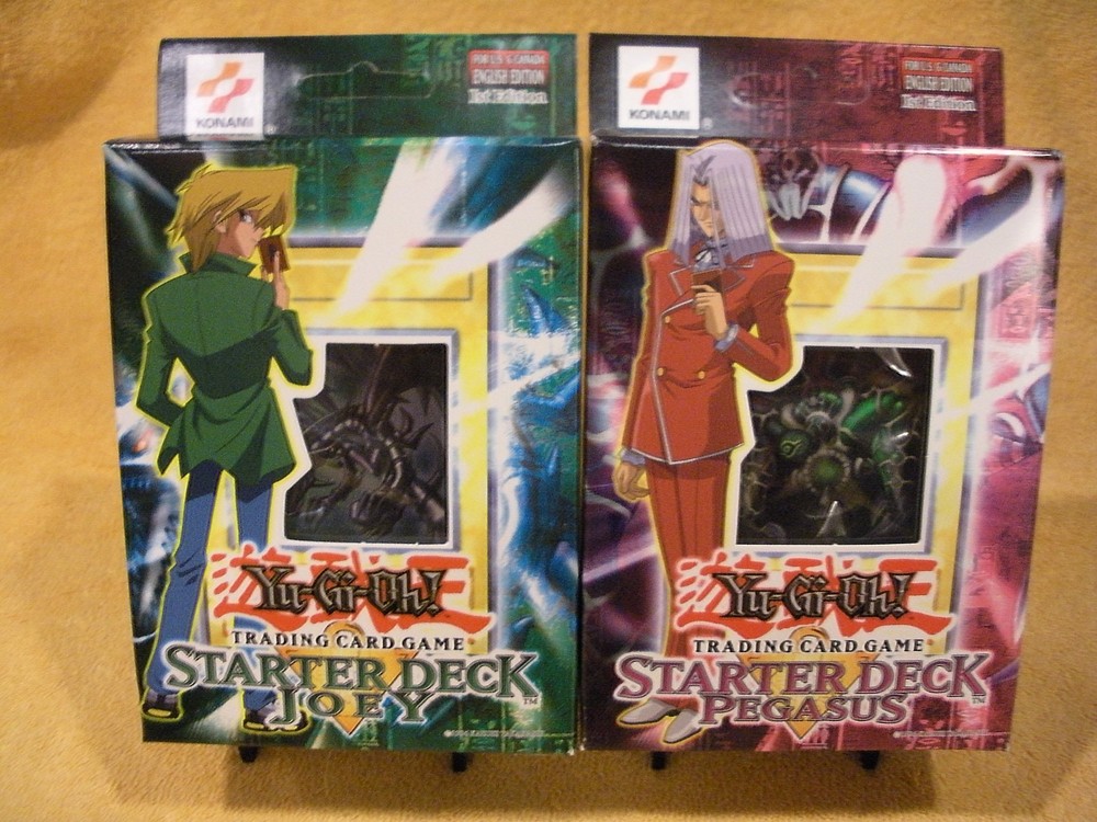 YU-GI-OH FIRST EDITION JOEY AND PEGASUS NEW IN BOX + SEALED CONDITION STARTER DECKS, FRESH FROM BOX NEAR MINT/MINT 2 FACTORY SEALED DECKS 1 OF EACH FREE SHIPPING Up for sale are 2 Factory Sealed NEW IN BOX + CONDITION FIRST EDITION DECK. 1 JOEY AND 1 PEGASUS STARTER DECKS, straight from a mint box. Each deck is near/mint, mint, brand new and still factory sealed. Made by Upper Deck, these decks each have 50 cards which contain 47 common cards and 3 foil cards. There is 1 rule book and 1 game mat. ALL OF THE CARDS IN EACH JOEY DECK AND PEGASUS DECK ARE THE SAME. SHIPPING, INSURANCE, INCLUDED