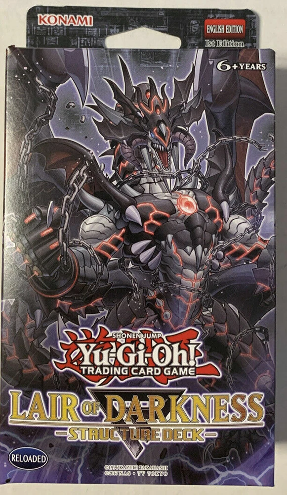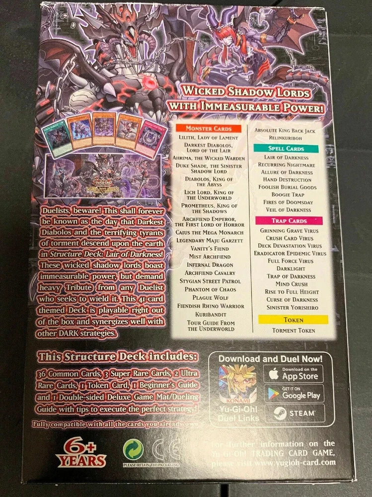 Duelists, beware! April 20th, 2018 shall forever be known as the day that Darkest Diabolos and the terrifying tyrants of torment descend upon the earth in Structure Deck: Lair of Darkness ! These wicked shadow lords boast immeasurable power, but demand heavy Tribute from any Duelist who seeks to wield it. Fortunately, villainy is the norm in the Lair of Darkness , and these monstrous dukes of deception aren’t that picky about whose monsters are being Tributed as long as this new Field Spell is in play! Monsters Tributed while Lair of Darkness is in play will find no rest in the Graveyard – their souls will return to the field at the end of the turn in which they were Tributed. The vicious visage of Darkest Diabolos, Lord of the Lair holds no hint of compassion or mercy, not even for cards that have yet to be played – his special ability lets you Tribute a DARK monster to interfere with your opponent’s hand! Special Summoning Diabolos is no trouble either thanks to his powerful Summoning ability that will naturally trigger as you advance your gameplan. For the Duelist who prefers to sit back and watch their opponent’s strategy self-destruct, Lilith, Lady of Lament has prepared the brand-new Grinning Grave Virus . This Virus requires the Tribute of a DARK monster to activate, then unleashes a deadly epidemic on your opponent’s hand and Deck! Structure Deck: Lair of Darkness is playable right out of the box, but many of its cards are right at home in Decks built using monsters from the upcoming Dark Saviors special booster set as well! Each Structure Deck: Lair of Darkness contains: 36 Common Cards 3 Super Rare Cards 2 Ultra Rare Cards 1 Token Card 1 Beginner’s Guide 1 Double-sided Deluxe Game Mat/Dueling Guide