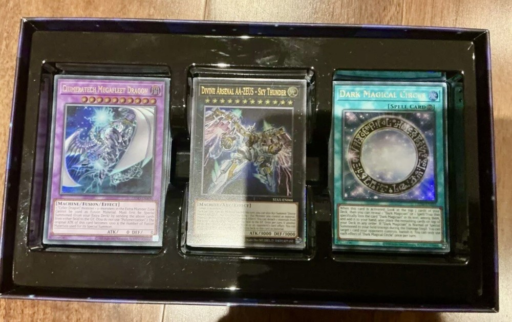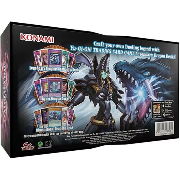Product Details - Box is not sealed but each deck is factory sealed The Yu-Gi-Oh! Trading Card Game is a Japanese collectible card game developed and published by Konami. It is based on the fictional game of Duel Monsters created by manga artist Kazuki Takahashi, which appears in portions of the manga franchise Yu-Gi-Oh! (The trading card game was launched by Konami in 1999 in Japan and March 2002 in North America) RARITY Common (C) | identified by their card name's plain black text—if they're a monster. Common spells, traps, and xyz monsters instead have white text. Rare (R) | Gray or Gray-outlined text, not foil. Super Rare (SR) | Non-foil name, foil card. Ultra Rare (SR) | Gold name, foil. Ultimate Rare (UtR) | Gold and embossed name, foil. Ghost Rare (GR) | Silver name, pale art. Holographic Rare (HGR) | Silver name, pale art. (Japanese version of Ghost Rare). Platinum Rare (PlR) | Platinum name, foil. Alternate/Starlight Rare (AltR) | White name, special horizontally-lined foil. SECRET RARES Standard secret rares are have distinctive rainbow-colored card names, but can have some variationsin the title's font color. (The odds of obtaining a secret rare are 1:23). Secret Rare (ScR) | Holographic rainbow card name. Prismatic Secret Rare (PScR) | Foil uses horizontal and vertical pattern rather than diagonal. Extra Secret Rare (EScR) | Applies Secret Rare pattern over whole card. Platinum Secret Rare (PlScR) | Platinum card name, foil art. Ultra Secret Rare (UScR) | Secret Rare name, Ultra Rare image. 20th Secret Rare (20ScR) | Holographic red card name. Secret Ultra Rare - misprint (ScUR) | Gold name, Secret foil image. 10000 Secret Rare (10000ScR) | Black name, Secret foil image. GOLD RARES Gold rares bear a shiny golden font and holographic sheen. Again, it's a cool look, but when mixed with other rarities, it's easy to see how confusing the system gets—you're not just distinguishing between gold rares and secret rares, but also gold secret rares. Gold Rare (GUR) | Gold name with reflective sheen image. Gold Secret Rare (GScR) | Gold Rare name with Secret Rare texture. Ghost/Gold Rare (GGR) | Gold-outlined name with Ghost Rare image. Premium Gold Rare (PGR) | Ultra Rare with thick golden frame. PARALLEL RARES "Parallel Rare" is a generic term for completely-holographic card . Parallel rares make the entire surface of a card (not just the name or artwork) holographic, leading to a "hazy" look. Normal parallel rares are actually glossed-up versions of commons. Parallel Rares (Normal, Super, Ultra, Holographic, Secret and Extra Secret) | each of these cards will come in a very hazy coating. Starfoil Rare (SFR) | Star pattern surface. Mosaic Rare (MSR) | Square pattern surface. Shatterfoil Rare (SHR) | Shattered glass-esque surface. Collectors Rare (CR) | Rainbow reflective surface. Millennium Rare (CR) | Vertical Egyptian hieroglyphics and grainy particles.