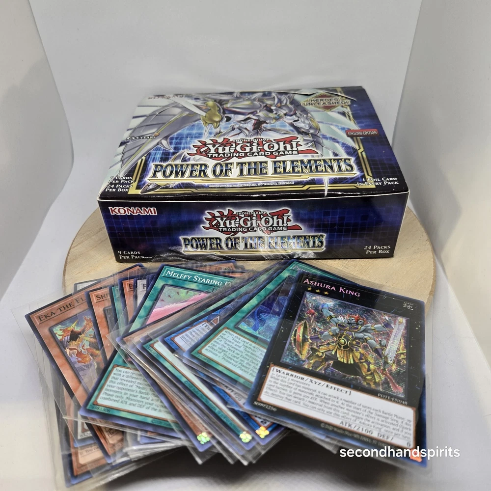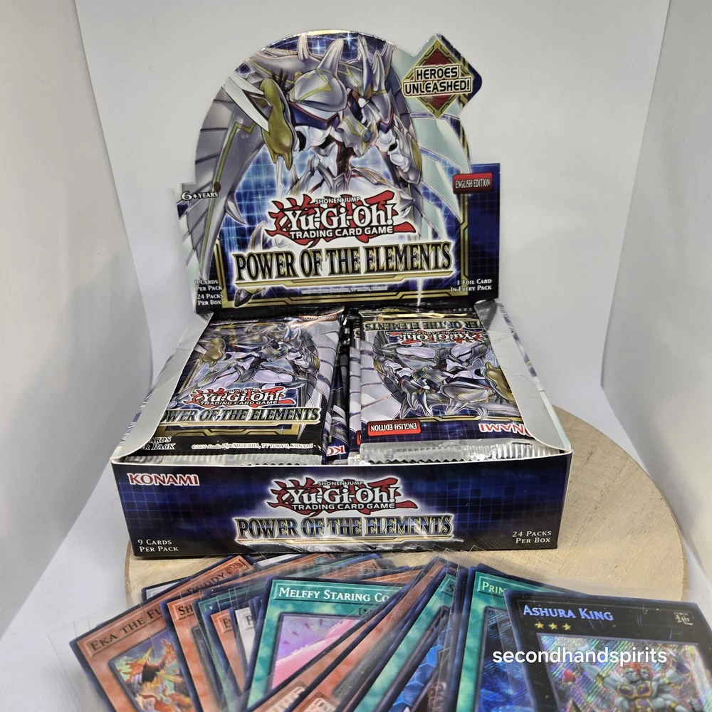 This is for a box of Yugioh Power of the Elements. Heroes Unleashed English Edition. 24 packs of cards All packs have been opened. The foil card was removed and put into a plastic sleeve. Those 24 cards are included. NOTE picture only shows 23 cards.I counted these cards three times and came up with 24 cards. One must have been hiding when I photographed. My son buys looking for a particular card and gives it to me to sell.