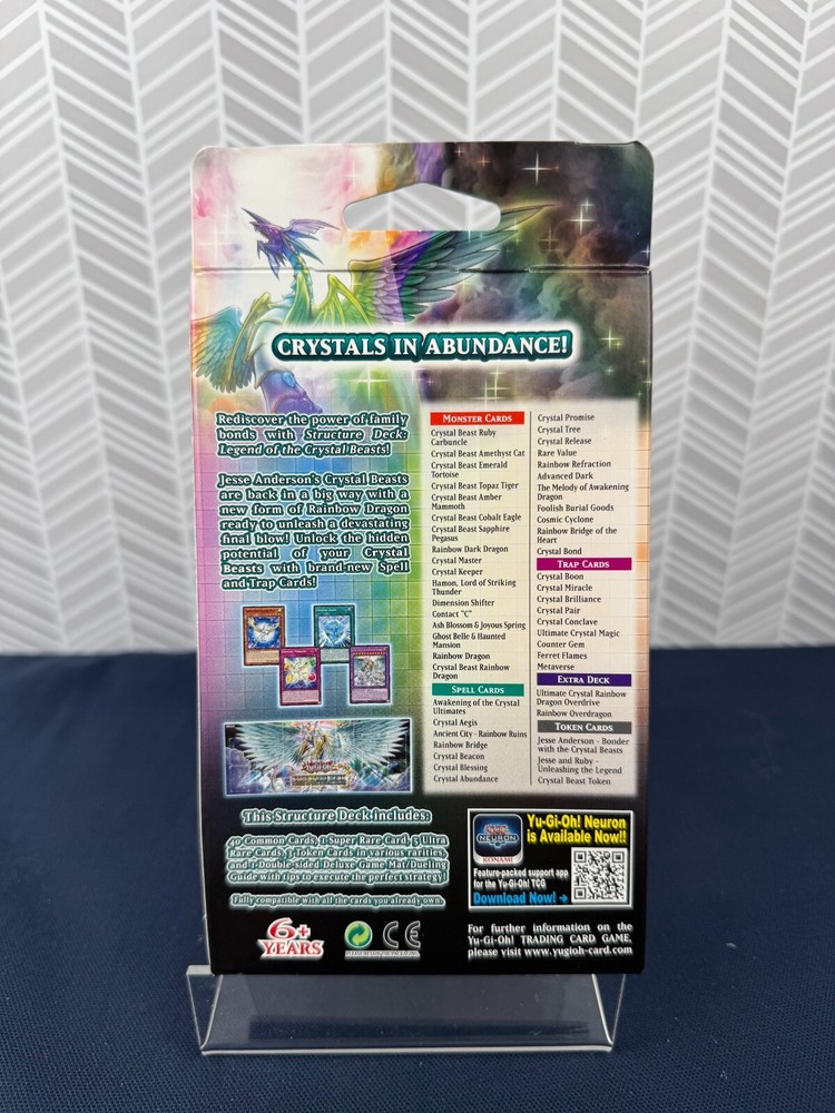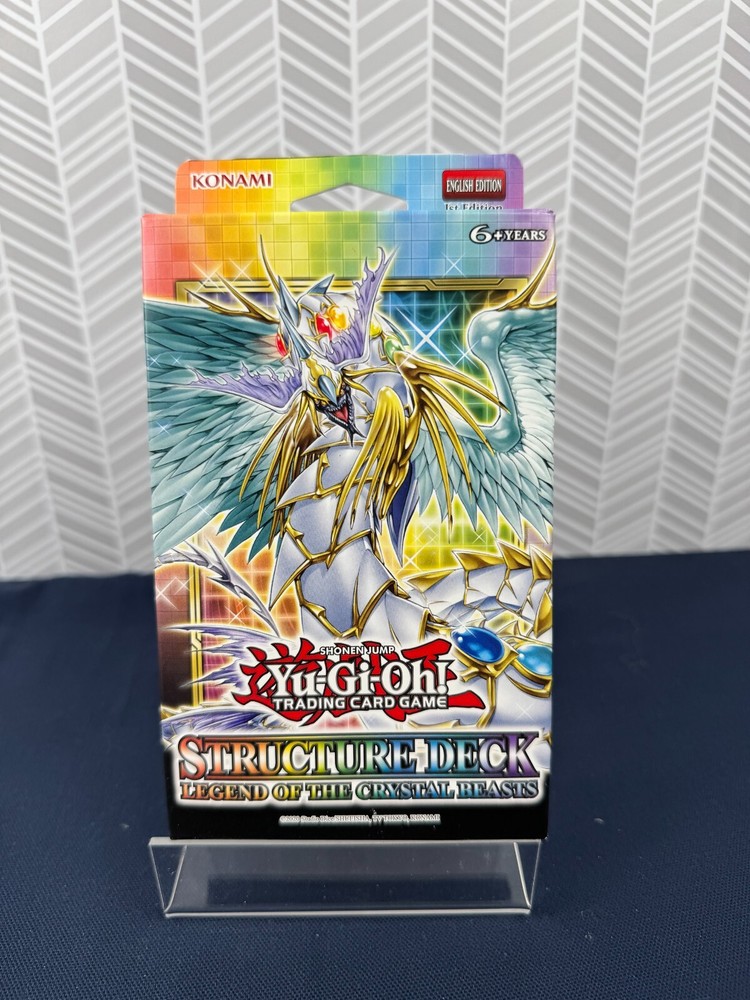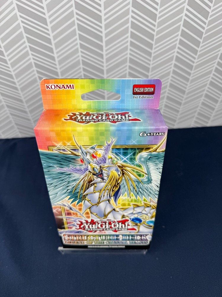 The product is a Yu-Gi-Oh! Trading Card Game Structure Deck titled "Legend of Crystal Beasts," manufactured by Konami in 2021. It contains 46 English language cards featuring the character Crystal from the Yu-Gi-Oh! TV show. The deck includes popular cards like "Ash Blossom" and is suitable for players aged 6 and up. The set offers a themed deck for players to use in the Yu-Gi-Oh! TCG, adding to their collection and gameplay options. Item may have some some condition issues please look at the pictures. There might be some issues with bends missing or ripped pages and/or some other cosmetic issues. We to make sure everything is detailed and we will answer any questions you might have before purchase. Thank you for being so interested. All items are packed with extreme care. We record the entire packing process and put security labels to ensure your item arrives packed as you expect and untampered. Please feel free to reach out if you have any questions.
