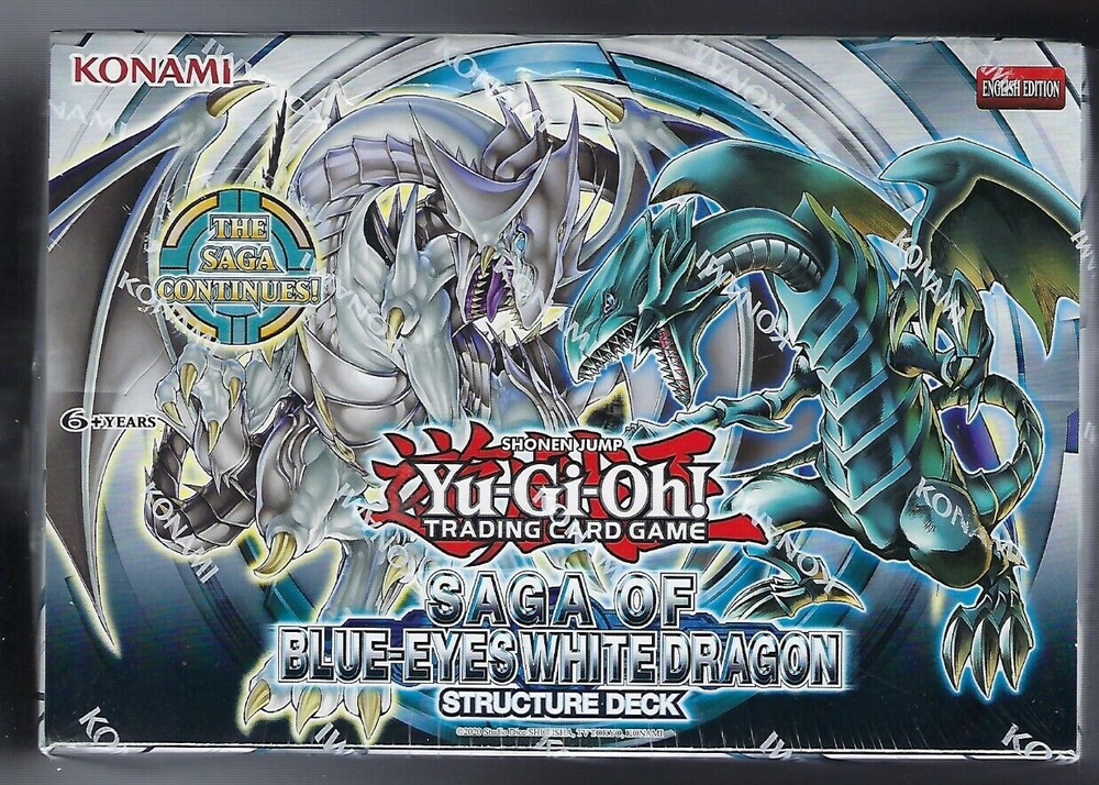 Yu-Gi-Oh Saga of the Blue-Eyes White Dragon Structure Deck Box (2022) Nothing in the Yu-Gi-Oh! TRADING CARD GAME universe is as legendary as the Blue-Eyes White Dragon. From the earliest of times, Blue- Eyes was the most powerful monster rivaled by very few other monsters. Now the legend comes to crush opponents with its new powers! Behold, the Saga of Blue-Eyes White Dragon Structure Deck built around the Blue-Eyes White Dragon card at its core. That's not all, introducing Azure-Eyes Silver Dragon, a powerful new Synchro Monster whose impact is immeasurable. Never before has a Structure Deck been released revolving around such an iconic card. Only the strong at heart have what it takes to wield this Deck to Victory. Duelists can find additional synergy with cards from Judgment of the Light, Lord of the Tachyon Galaxy, and Cosmo Blazer booster sets! This Structure Deck Contains : - [37] Common Cards - [2] Ultra Rare Card - [2] Super Rare Cards - [1] Rulebook - [1] Game Mat - [1] Dueling Guide Configuration : 8 decks per box