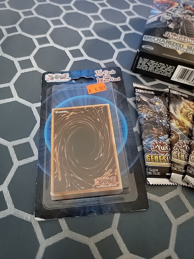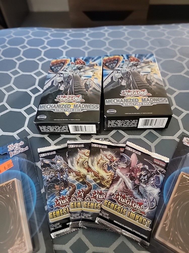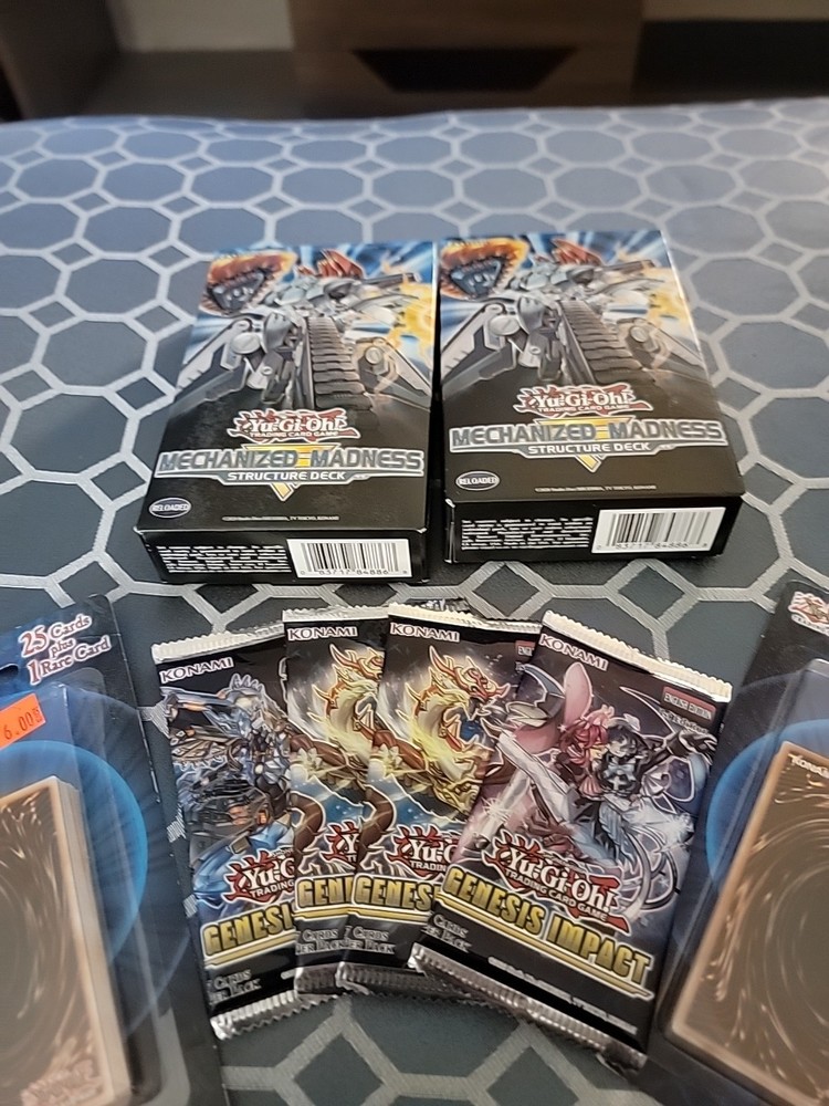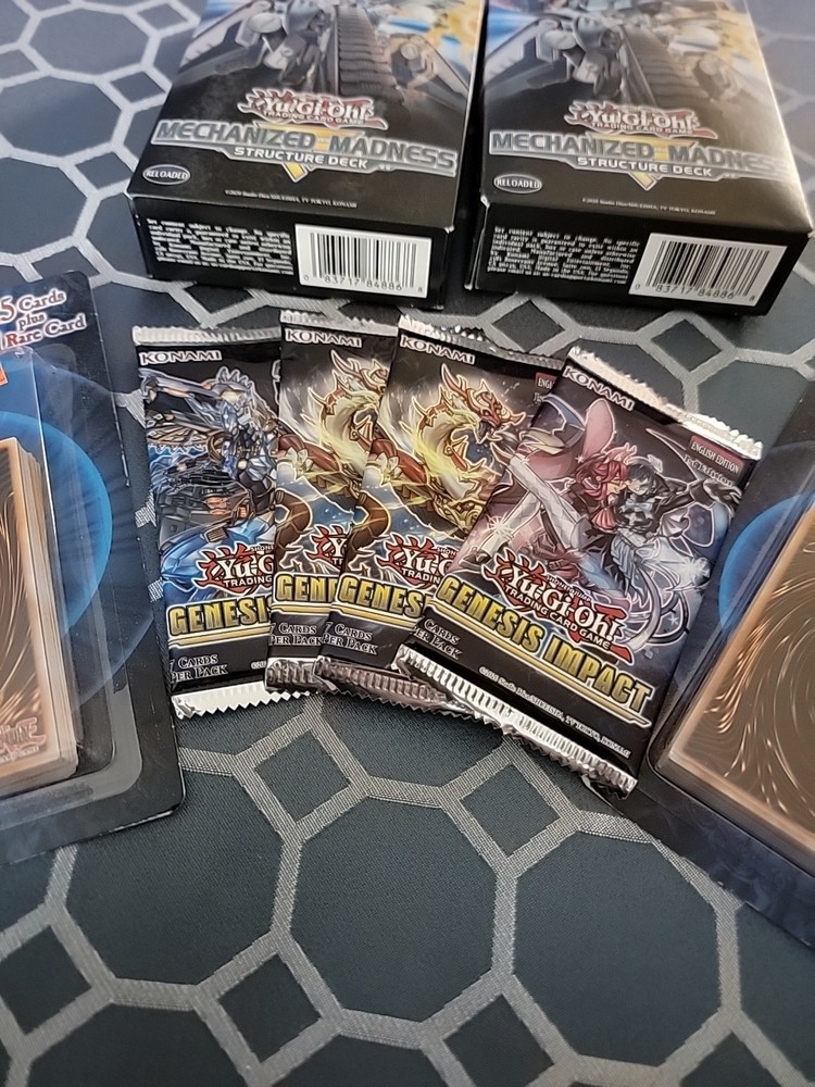 2 structure decks, 2 assorted official repacks and 4 sealed booster packs. Boosters are Genesis Impact Structure decks are both Mechanized Madness....