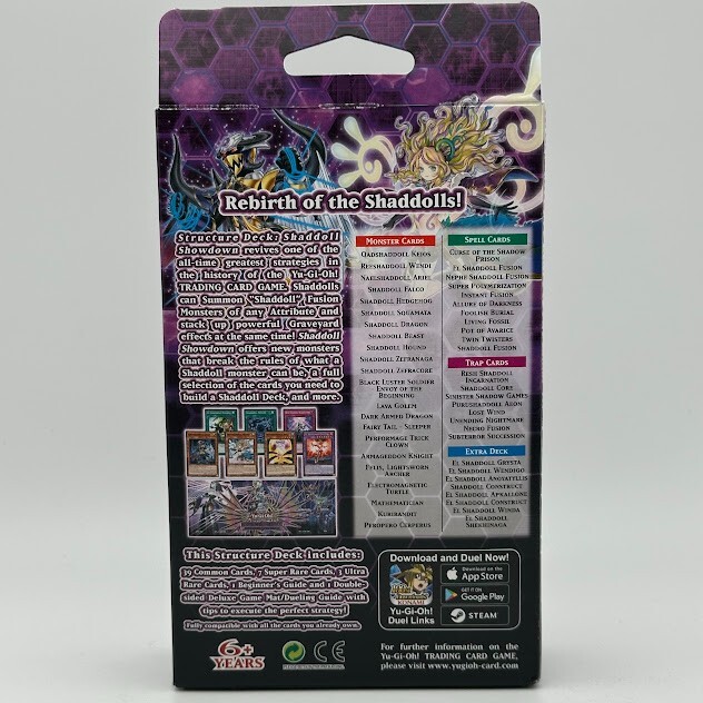 Harness the power of flip monsters and Fusion combos with the Shaddoll Showdown Structure Deck , factory‑sealed and stamped 1st Edition . Released February 14, 2020, this deck provides everything you need to build a competitive Shaddoll strategy straight out of the box. Key Features: 49‑Card Preconstructed Deck: Comes complete with 7 Super Rares and 42 Commons , delivering the core of your Shaddoll Fusion engine Super Rare Flip Monsters & Spells: Qadshaddoll Keios (SR): Flip to disrupt your opponent and set up Fusion materials Reeshaddoll Wendi (SR): Flip to burn and search other Shaddolls Naelshaddoll Ariel (SR): Flip to negate Spell/Trap cards El Shaddoll Winda (SR): Fusion boss that locks your opponent’s extra deck summons El Shaddoll Shekhinaga (SR): Fusion boss with hand disruption Reshaddoll Incarnation (SR): Flip to mill and Fusion‑summon Shaddoll Fusion (SR): The spell that lets you Fusion‑summon using deck monsters Core Shaddoll Monsters (Commons): Shaddoll Falco , Hedgehog , Squamata , Dragon , Beast , Hound , Zefraxa (flip effects fuel your Fusion plays) Powerful Staple Support (Commons): El Shaddoll Core & Unending Nightmare for consistency Armageddon Knight , Mathematician , Kuribandit to fill your GY and search materials Heavy hitters like Black Luster Soldier – Envoy of the Beginning , Dark Armed Dragon , Lava Golem , and Fairy Tail – Sleeper to control the board Fusion‑Heavy Strategy: Use Shaddoll Fusion alongside your flip monsters to summon powerful Fusion monsters that punish opponents when they’re Special Summoned Official Konami Quality: Authentically licensed, brand‑new, and factory‑sealed for pristine card condition, ready for tournament play or collector display. SEO Highlight: Yugioh Shaddoll Showdown Structure Deck 1st Edition Factory Sealed – the exact search term Shaddoll fans use to find this complete Fusion‑focused deck. Why You’ll Love This Deck: Instant Competitive Play: No deckbuilding required—simply unseal, shuffle, and unleash Shaddoll Fusion combos from your very first duel. Versatile Flip Effects: Flip your way to card advantage, disruption, and Fusion summons with every card you play. Collector’s Must‑Have: First Edition sealed status makes this deck a valuable addition to any Yu‑Gi‑Oh! collection and a solid long‑term investment. Ideal Gift & Prize Support: A thrilling reward for tournaments or an unforgettable gift for duelists seeking powerful Fusion strategies. Click “Add to Cart” now to dominate the duel field with the Structure Deck: Shaddoll Showdown 1st Edition and elevate your Fusion game to new heights! Happy dueling!