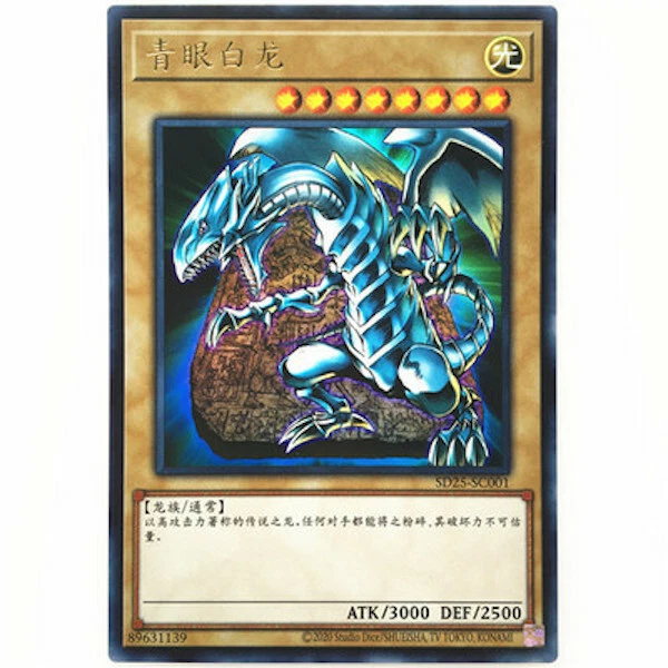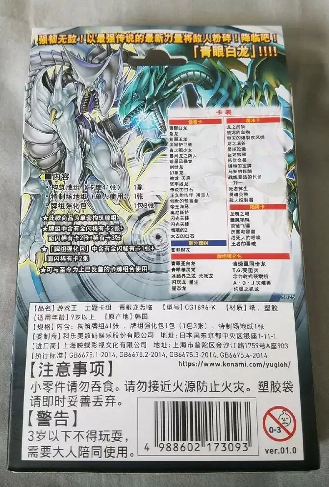 Yu-Gi-Oh! Simplified Chinese Version Structure Deck: The Blue-Eyed Dragon's SD25 KONAMI Official Authentic Yu Gi Oh TCG Products ! Simplified Chinese Version Structure Deck: The Blue-Eyed Dragon's Thundering Descent - Official Product (SD25) Includes: Deck Box 1 construction deck (41 cards) SDBE-EN001 artwork in Simplified Chinese Card number English name Simplified Chinese name Rarity Category Quantity SD25-SC001 "Blue-Eyes White Dragon" "青眼白龙" Ultra Rare Normal Monster 1 SD25-SC002 "Rabidragon" "兔龙" Common Normal Monster 1 SD25-SC003 "Alexandrite Dragon" "紫翠玉龙" Common Normal Monster 1 SD25-SC004 "Flamvell Guard" "炎狱护卫者" Common Normal Tuner monster 1 SD25-SC005 "Maiden with Eyes of Blue" "青之眼少女" Super Rare Effect Tuner monster 1 SD25-SC006 "Rider of the Storm Winds" "暴风龙之防人" Rare Effect Tuner monster 1 SD25-SC007 "Darkstorm Dragon" "暗黑风暴龙" Common Gemini monster 1 SD25-SC008 "Genesis Dragon" "创世龙" Common Effect Monster 1 SD25-SC009 "Mirage Dragon" "幻象龙" Common Effect Monster 1 SD25-SC010 "Divine Dragon Apocralyph" "神龙 天启" Common Effect Monster 1 SD25-SC011 "Hardened Armed Dragon" "坚甲战龙" Common Effect Monster 1 SD25-SC012 "The White Stone of Legend" "传说的白石" Common Effect Tuner monster 1 SD25-SC013 "Kaibaman" "正义的伙伴 海马人" Common Effect Monster 1 SD25-SC014 "Herald of Creation" "创世的预言者" Common Effect Monster 1 SD25-SC015 "Kaiser Sea Horse" "帝王海马" Common Effect Monster 1 SD25-SC016 "Honest" "奥尼斯特" Common Effect Monster 1 SD25-SC017 "Shining Angel" "闪光天使" Common Effect Monster 2 SD25-SC018 "Maxx "C"" "增殖的Z" Common Effect Monster 1 SD25-SC019 "The White Stone of Ancients" "太古的白石" Common Effect Tuner monster 1 SD25-SC020 "Dragon Shrine" "龙之灵庙" Super Rare Normal Spell 1 SD25-SC021 "Silver's Cry" "银龙的轰咆" Rare Quick-Play Spell 1 SD25-SC022 "Burst Stream of Destruction" "毁灭的爆裂疾风弹" Common Normal Spell 1 SD25-SC023 "Dragon Ravine" "龙之溪谷" Common Field Spell 1 SD25-SC024 "Terraforming" "星球改造" Common Normal Spell 1 SD25-SC025 "A Wingbeat of Giant Dragon" "巨龙振翅" Common Normal Spell 1 SD25-SC026 "Trade-In" "抵价交易" Common Normal Spell 1 SD25-SC027 "Cards of Consonance" "调和的宝牌" Common Normal Spell 1 SD25-SC028 "White Elephant's Gift" "马骨的报酬" Common Normal Spell 1 SD25-SC029 "Symbols of Duty" "战线复活的代价" Common Equip Spell 1 SD25-SC030 "One for One" "一对一" Common Normal Spell 1 SD25-SC031 "Monster Reborn" "死者苏生" Common Normal Spell 1 SD25-SC032 "Soul Exchange" "灵魂交换" Common Normal Spell 1 SD25-SC033 "Enemy Controller" "敌人控制器" Common Quick-Play Spell 1 SD25-SC034 "Castle of Dragon Souls" "龙魂之城" Rare Continuous Trap 1 SD25-SC035 "Fiendish Chain" "噩魔锁链" Common Continuous Trap 1 SD25-SC036 "Kunai with Chain" "锁链飞镖" Common Normal Trap 1 SD25-SC037 "Damage Condenser" "伤害电容器" Common Normal Trap 1 SD25-SC038 "Call of the Haunted" "活死人的呼唤" Common Continuous Trap 1 SD25-SC039 "Champion's Vigilance" "王者的看破" Common Counter Trap 1 SD25-SC040 "Azure-Eyes Silver Dragon" "苍眼银龙" Ultra Rare Effect Synchro Monster 1 Simplified Chinese means this product is released in China Mainland Only. ( SD25 release Date is 26th.Sep 2020) Buy will get the box as picture shows. the box DOES NOT INCLUDE the deck enhancement pack. Payment Delivery details Terms of sales About us Contact us Payment Customs, Duties and Taxes Import duties, taxes and charges are not included in the item price or shipping charges. These charges are the buyer's responsibility. Please check with your country's customs office to determine what these additional costs will be prior to bidding/buying. These charges are normally collected by the delivering freight (shipping) company or when you pick the item up – do not confuse them for additional shipping charges. Delivery details Terms of sales About Item All items sold by us are being described to the best of our abilities, as accurate as possible, and with utmost conscientiousness on our part. However, to avoid any potential oversights, I respectfully request your assistance in helping us to make this a mutually satisfactory transaction by THOROUGHLY reviewing item description and photos, and asking all questions PRIOR TO BIDDING. Please Note that size and color representation are subject to manufacturing variance and may not be exact. Also note that monitor settings may vary from computer to computer and may distort actual colors. Please read these terms thoroughly before placing your bid. Returns In case you received a defective item, the customer has up to 3 days from date of receipt to request for refund or exchange for a new one. In case you received a wrong item, Items must be returned in its original and unused condition & must also be in its original box and packing. We do not allow refunds or exchanges because of change of mind. Please read all description provided as a guide before you bid. While every step has been taken to ensure that we ship out correct item, there will be occasion when you receive items that are different from the description. In such case, we ask that you contact us immediately so we may remedy the situation. Your satisfaction is important to us and we value your business. Customs, Duties and Taxes Import duties, taxes and charges are not included in the item price or shipping charges. These charges are the buyer's responsibility. Please check with your country's customs office to determine what these additional costs will be prior to bidding/buying. These charges are normally collected by the delivering freight (shipping) company or when you pick the item up – do not confuse them for additional shipping charges. Customer Satisfactory Do not hesitate to contact us anytime before and after your purchase; we are committed to your 