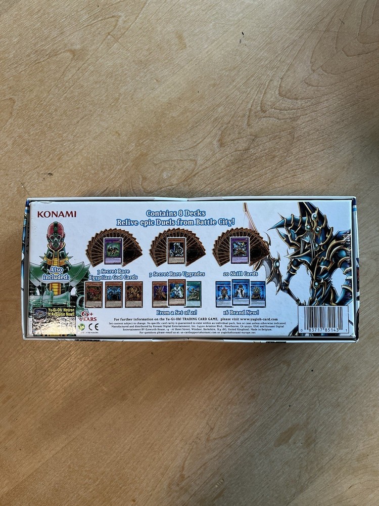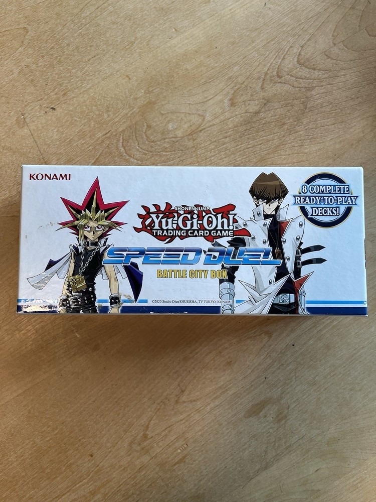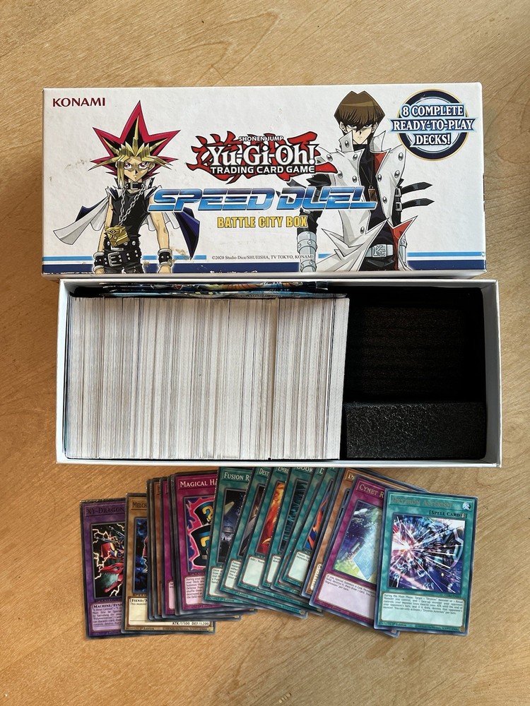 Yugioh speed duel battle city box opened but in great condition. Box includes 450 cards, some are not speed duel cards, came from other packs. All speed duel cards are 1st edition. From the battle city box, the following cards are missing: 044, 087, 092, 130, 167, 168, and 173.