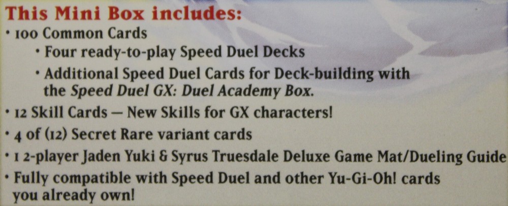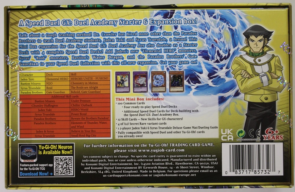What is for purchase is a sealed Yugioh Speed Duel GX Midterm Paradox Box Set. The item is sealed in new condition. Included are: 100 Common Cards - Four ready-to-play Speed Duel Decks - Additional Speed Duel Cards for Deck Building with the Speed Duel GX: Duel Academy Box 12 Skill Cards 4 of (12) Secret Rare 1-2 player Jaden Yuki & Syrus Truesdale Gaming Mat/Guide