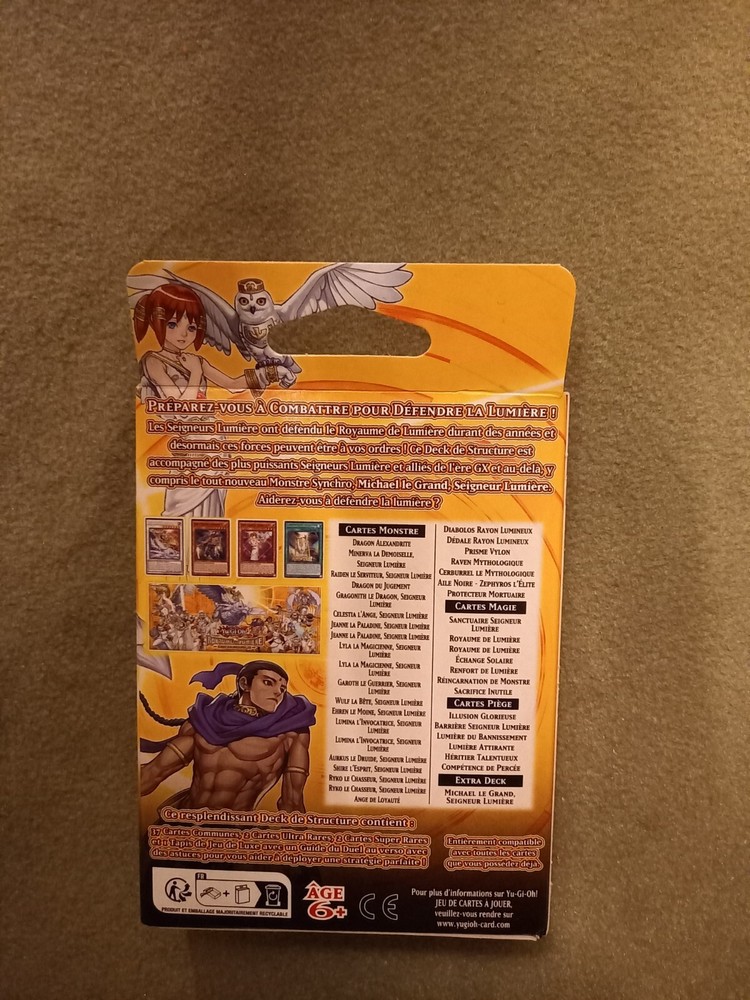 This deck is fantastic for both beginners and collectors! The French cards are crisp and brand new, with strong Light-attribute monsters and great support cards. The artwork is stunning, and the strategies are fun to build around. A must-have for Yu-Gi-Oh! fans looking for sealed structure decks in French. Very satisfied with the quality!