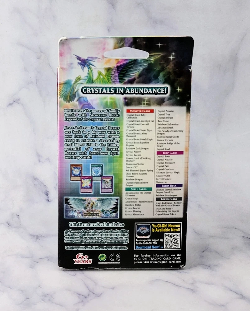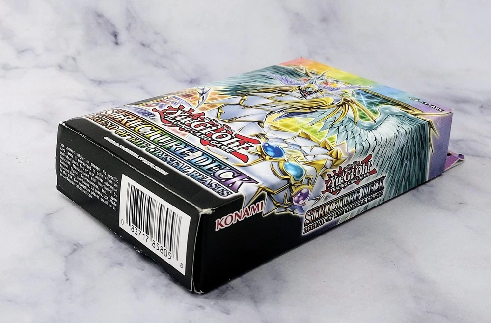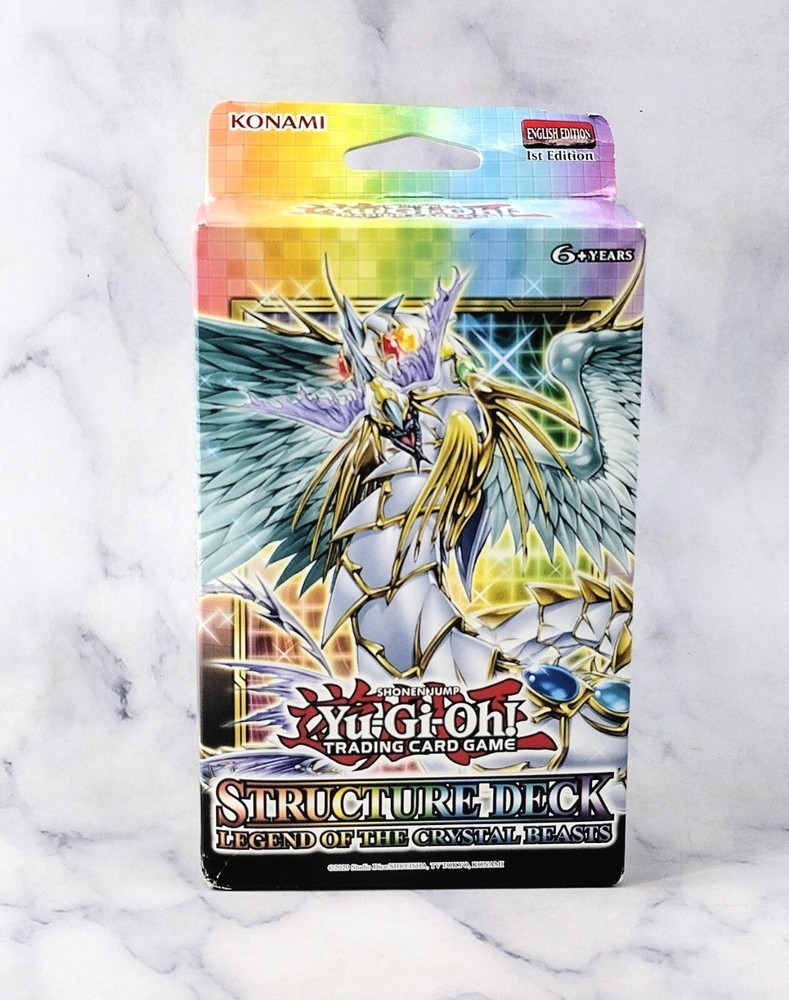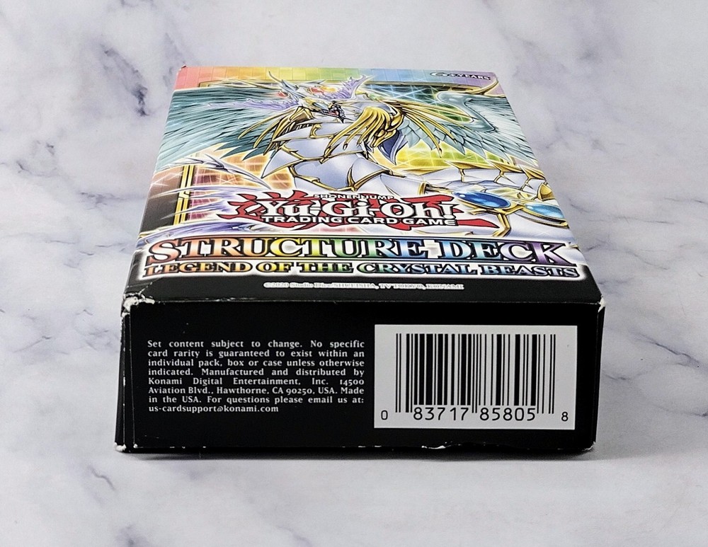 Konami Yu-Gi-Oh! - Legend of the Crystal Beasts Structure Deck Sealed Please see all of our original photos for the box you will receive. Top of the cardboard is bent as shown. New, factory sealed box. English 1st Edition includes: * 40 Common cards * 1 Super Rare card * 5 Ultra Rare cards * 3 Token cards in various rarities * 1 Double-sided Deluxe Game Mat/Dueling Guide with perfect strategy tips We are not responsible for cards inside the box. We ship with USPS first class mail. No international shipping please. Thanks from Buster's Place-stop by our store for more cards!