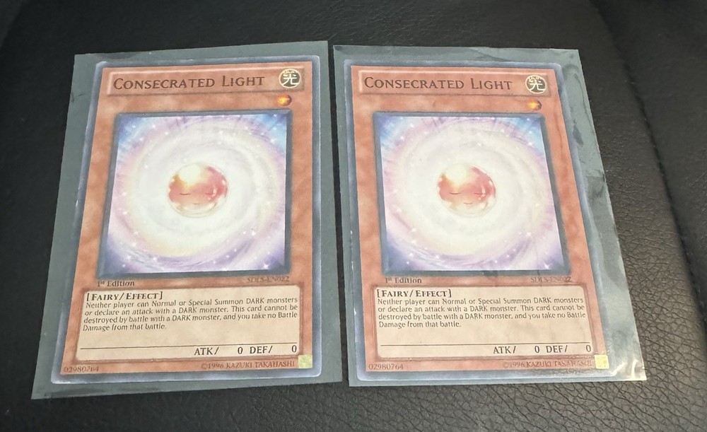 Yu-Gi-Oh! Structure Deck: Light Sanctuary (SDLS) 1st Edition Card Set Contains: 2x SDLS-EN022 Consecrated Light 1st Edition NM 1x SDLS-EN034 Return from the Different Dimension 1st Edition Lightly Played 1x SDLS-EN038 Solemn Judgement 1st Edition NM 1x SDLS-EN014 Hecatrice 1st Edition NM 1x SDLS-EN016 Soul of Purity and Light NM Message for individual cards on any orders or any questions!
