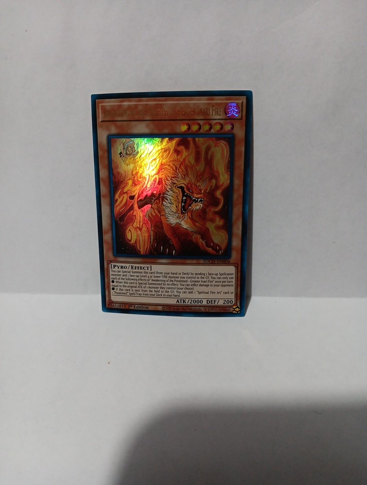 This Yu-Gi-Oh! TCG card is a fiery addition to any collection. The Awakening of the Possessed - Greater Inari Fire is a powerful Pyro monster with an Attack/Power of 2000 and Defense/Toughness of 200. It is an Ultra Rare, 1st Edition card from the Structure Deck: Spirit Charmers Set. This card is in near mint or better condition and is ungraded. Its card number is Sdch-En006 and it is an Effect type card. Enhance your Yu-Gi-Oh! card collection with this fantastic card.