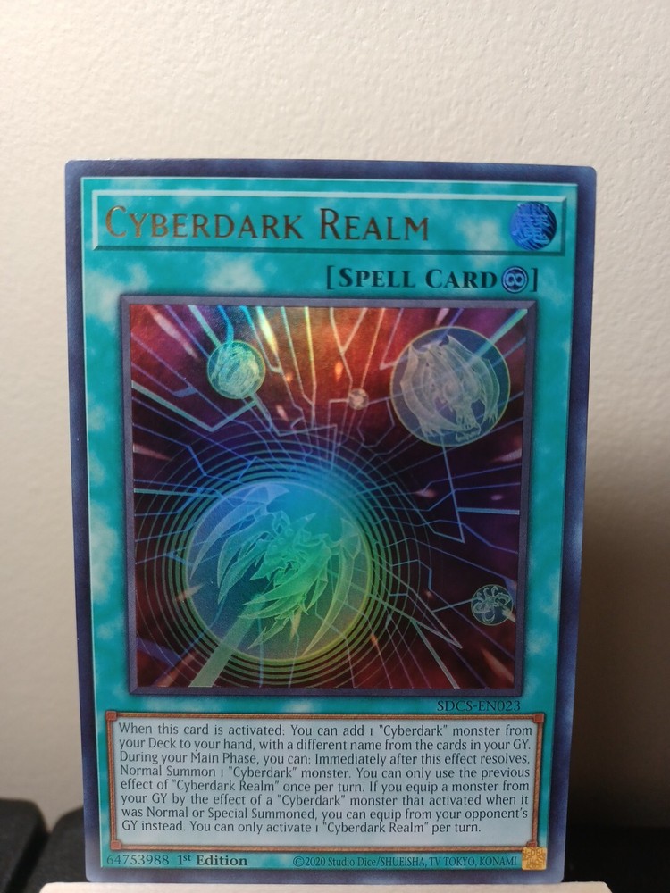 Cyberdark Realm 1st edition Ultra Rare from SDCS in NM condition. Please see pictures and feel free to ask any questions prior to purchase. All orders usually ship within 24 hours except on days USPS is closed. Most orders under $20 will ship via eBay standard envelope, orders over $20 will ship via USPS Ground Advantage. We do everything we can to ensure your purchase arrives in a timely manner and in the same condition shown on the listing. Please check out our eBay store as well for more cards and discounts.
