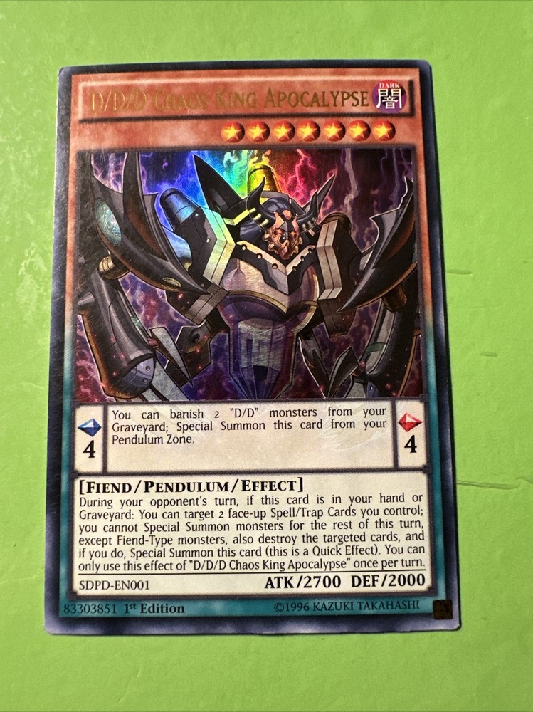 Enhance your Yu-Gi-Oh! TCG deck with the powerful D/D/D Chaos King Apocalypse from the Pendulum Domination structure deck. This Fiend/Pendulum/Effect monster boasts an impressive Attack of 2700 and a Defense of 2000, making it a formidable opponent on the field. As a bonus, this card is a 1st Edition and in near mint or better condition. Add the D/D/D Chaos King Apocalypse to your collection and dominate your opponents in the Yu-Gi-Oh! TCG. Don't miss your chance to own this rare and powerful card from the Pendulum Domination set.