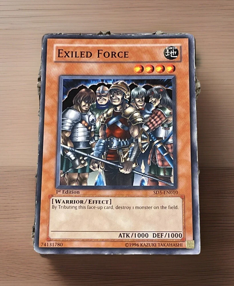 Please message me if you have any questions or concerns regarding the card. This Yu-Gi-Oh! TCG card is a must-have for any collector or player. The card features the powerful Exiled Force, with 1000 defense and 1000 attack. It is a 1st edition common card, with a regular finish, and belongs to the Structure Deck set. The card number is SD5-EN010 and it is an effect card. The card is lightly played and comes from the reputable manufacturer T C G. Its speciality is Earth and it belongs to the warrior creature/monster type. The card name is Exiled Force and it is a great addition to any collection. Get this card now and strengthen your Yu-Gi-Oh! TCG deck!