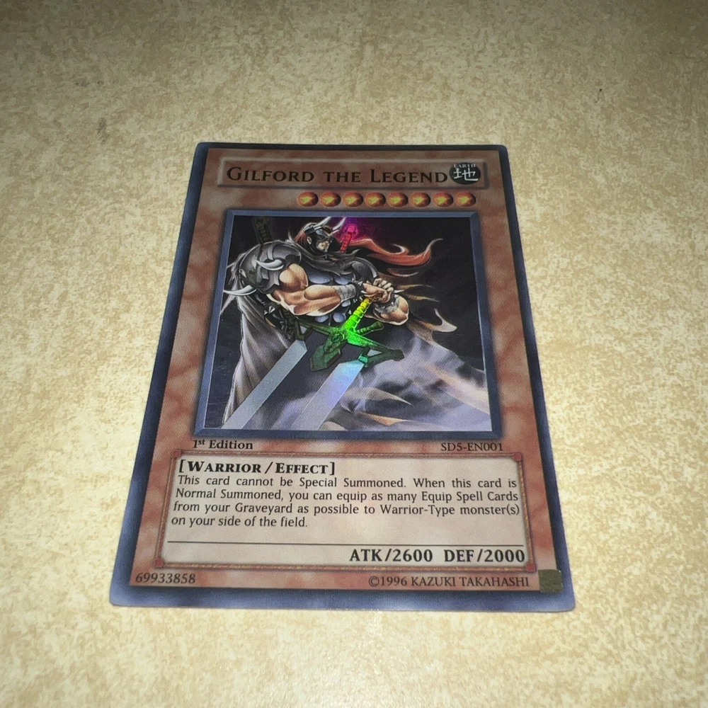 This Yu-Gi-Oh! TCG card features Gilford the Legend, a powerful Warrior creature with 2600 attack and 2000 defense. The card is part of the Structure Deck set and is a 1st Edition Ultra Rare, making it a highly sought-after addition to any collection. With an Effect card type and card number SD5-EN001, this card is perfect for any Yu-Gi-Oh! TCG player looking to add a unique and rare card to their deck. The card's Earth color and the fact that it is an Oracle card make it even more special. Don't miss your chance to own this amazing card!