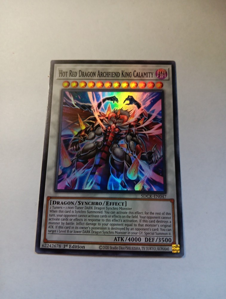 This is a rare and highly sought-after card from the Yu-Gi-Oh! TCG game. It features the Hot Red Dragon Archfiend King Calamity and is part of the Structure Deck: the Crimson King set. The card is a Super Rare 1st Edition Effect Synchro type with Card Number SDCK-EN047. Collectors and players alike will be thrilled to add this card to their collection. It's perfect for those who love to play the Yu-Gi-Oh! TCG game or for those who simply love collecting rare cards. Don't miss out on the opportunity to own this amazing card.