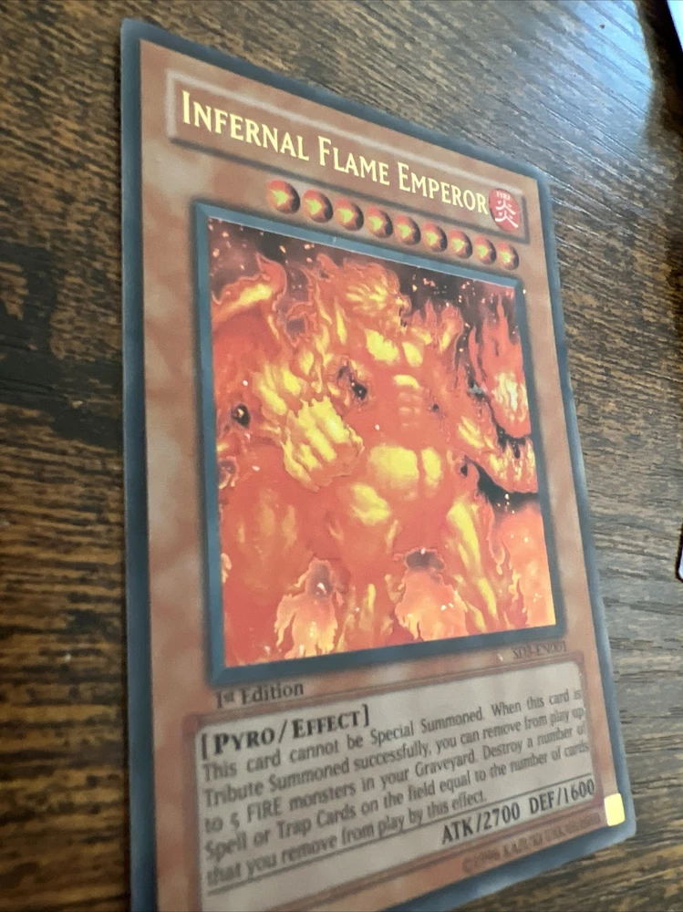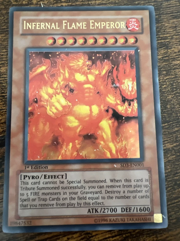 This Yu-Gi-Oh! TCG card is a powerful addition to any collection. With an attack power of 2700 and a defense toughness of 1600, the Infernal Flame Emperor is a force to be reckoned with. Its pyro creature/monster type and effect card type make it a unique and valuable card for any fan of the game. This 1st edition card, numbered SD3-EN001, is from the Structure Deck set and features the color Fire. As a collectible card game individual card, it is sure to impress both players and collectors alike. Add the Infernal Flame Emperor to your collection today.