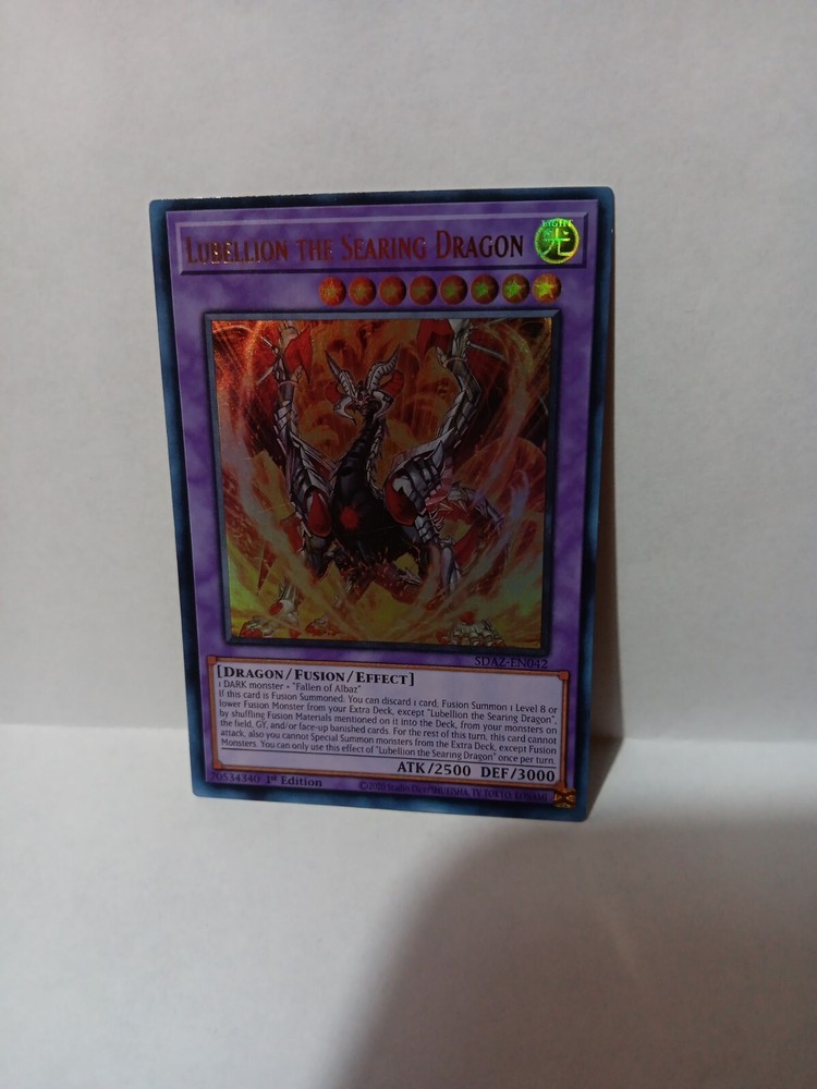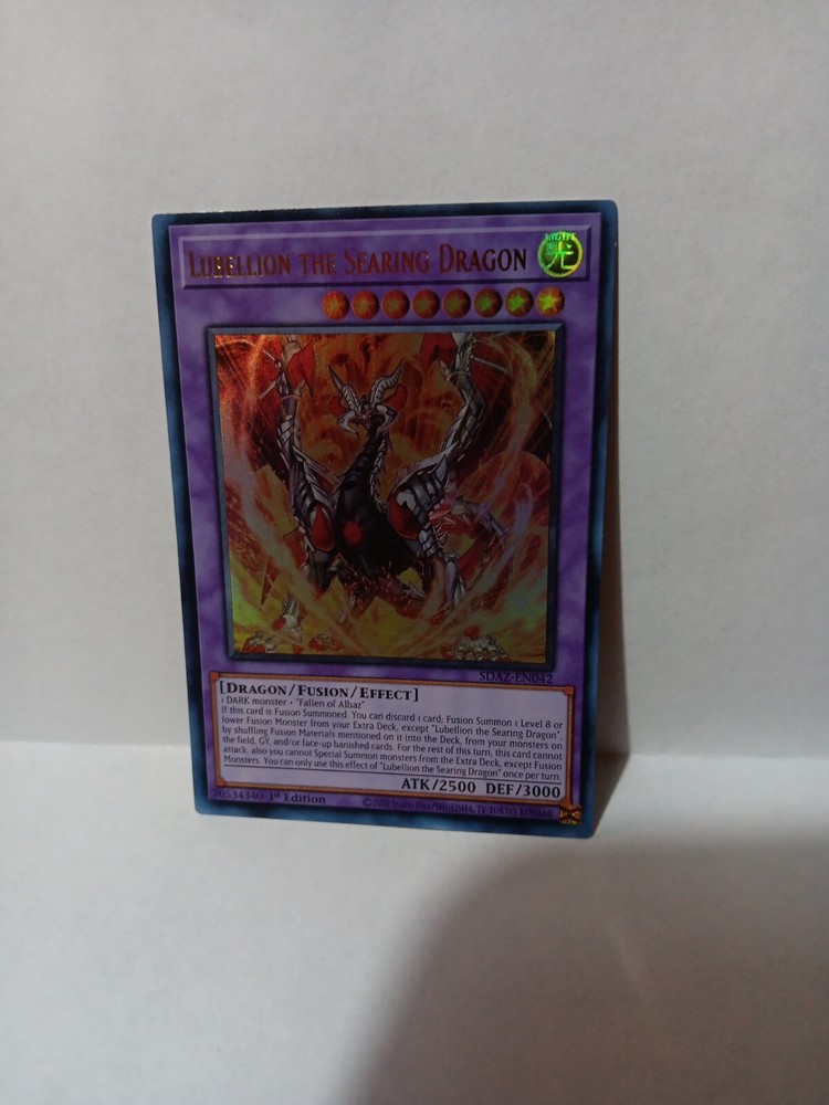 This Yu-Gi-Oh! TCG card, Lubellion the Searing Dragon, is part of the Structure Deck: Albaz Strike and has a fiery attack power of 2500. It belongs to the Dragon/Fusion creature/monster type and has a defense/toughness of 3000. This card is in its 1st edition and has the card number Sdaz-En042. The features of this card include its unique Attribute/MTG:Color of Light and its effect card type. It is a perfect addition for any Yu-Gi-Oh! TCG collector. Get your hands on this rare card before it's too late!