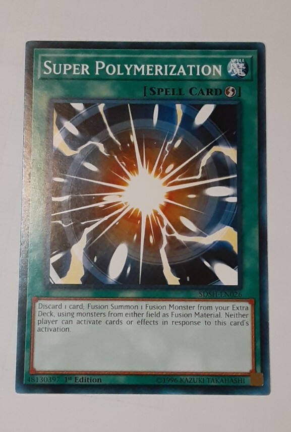 This Yu-Gi-Oh! TCG Super Polymerization card is a must-have for any collector or player. From the Shaddoll Showdown set, this 1st Edition Spell-Quick Play card with the number SDSH-EN026 is a rare find. Its unique features make it a valuable addition to any collection. Whether you're a fan of the Yu-Gi-Oh! TCG or simply enjoy collecting rare and unique cards, this Super Polymerization card is sure to impress. Add it to your collection today and take advantage of its powerful effects in your next game!