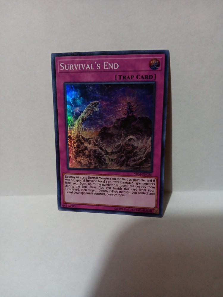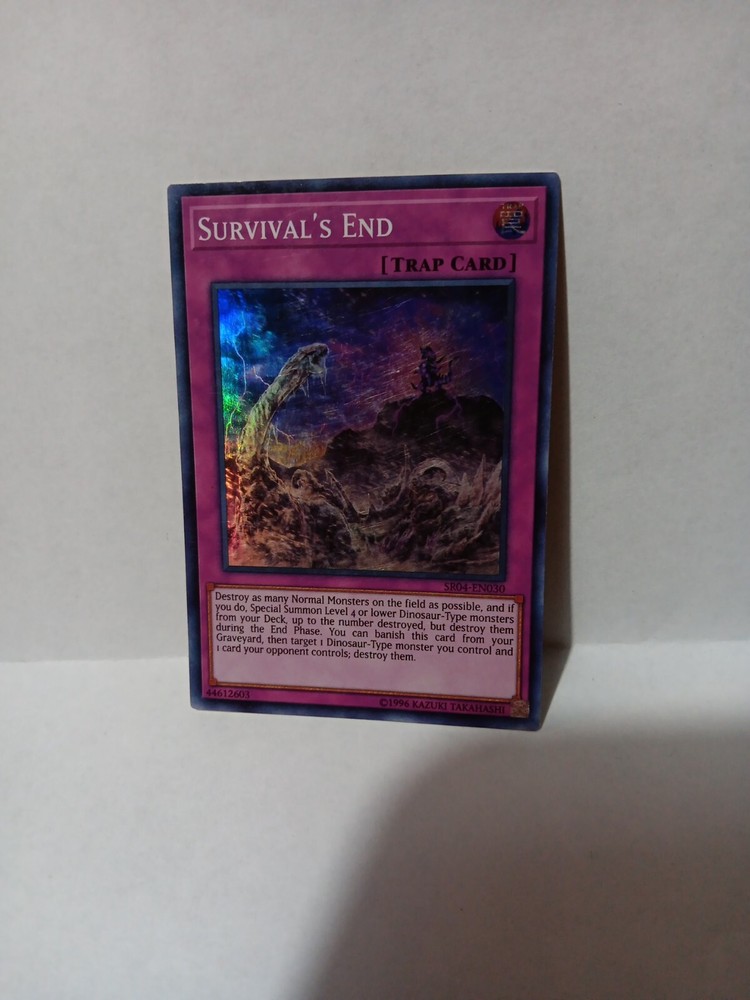 This Yu-Gi-Oh! TCG card, named Survival's End, is part of the Dinosmasher's Fury set and is a first edition. It is perfect for those who collect individual CCG cards or are looking to expand their collection. The card's features make it a valuable addition to any collection.