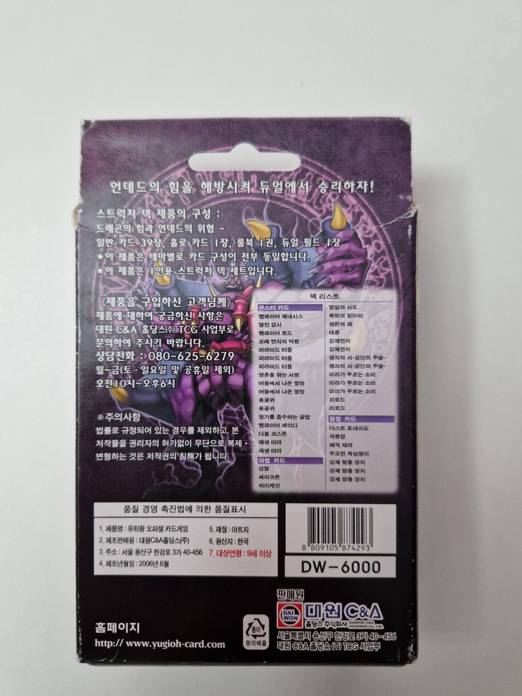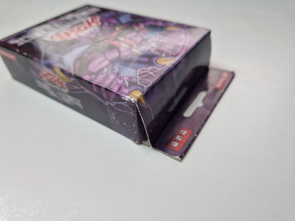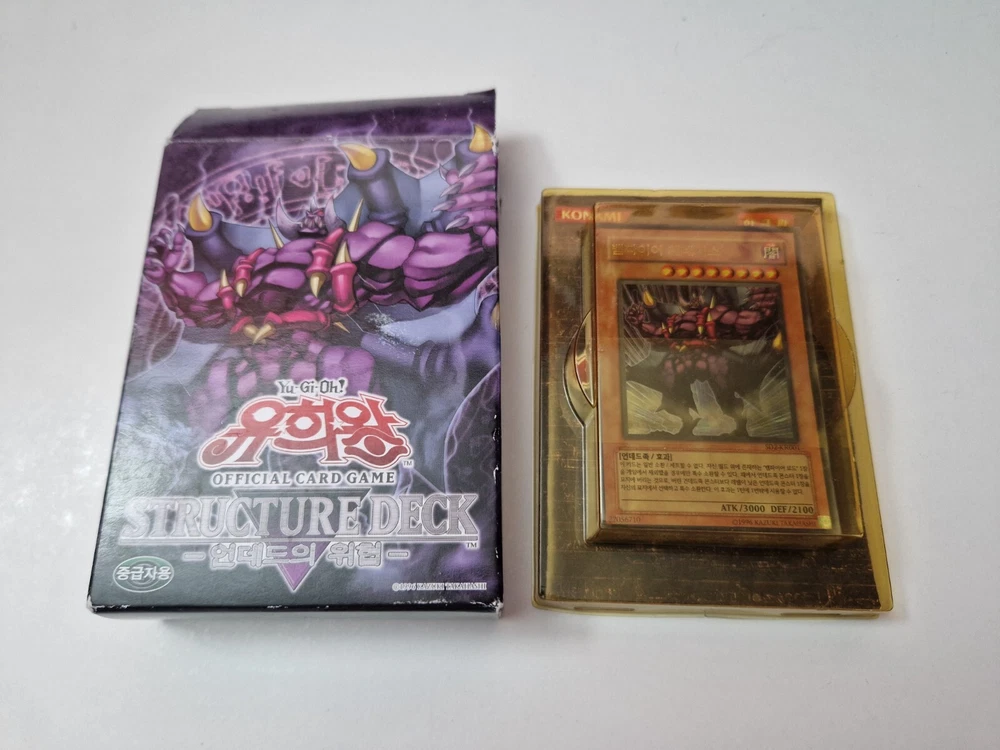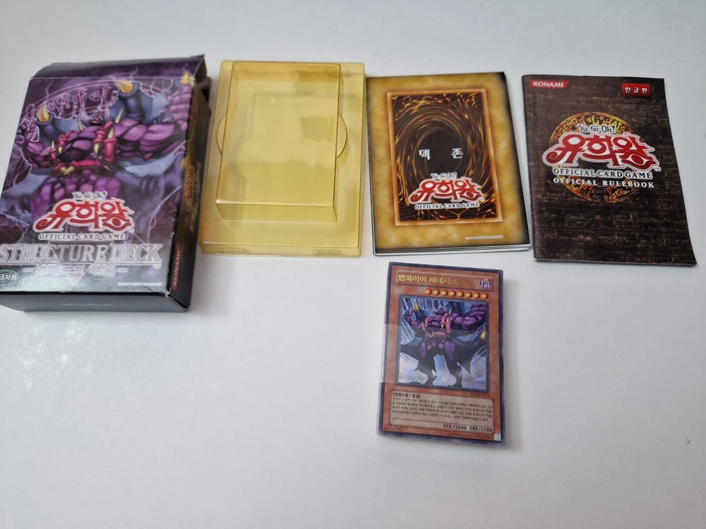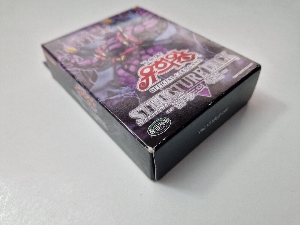 Selling the Yu-Gi-Oh Structure Deck - Zombie Madness Korean edition. Condition is like new - opened, but never used The item comes in the original box with playing field and manuals. Contains all 40 cards in the deck Marks around the edge of the box (see photos) The plastic protective packaging inside the box has discoloured (no issue to card or manuals) Very minor crease at corner of the card