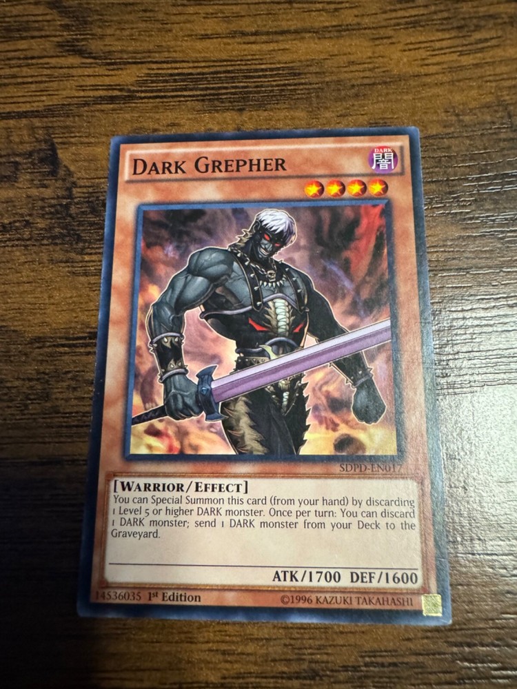 This Yu-Gi-Oh! card features the Dark Grepher, a warrior type creature with 1600 defense and 1700 attack power. It is a common/short print card from the Structure Deck: Pendulum Domination set, with an effect card type and SDPD-EN017 card number. The card is in English language and manufactured by Konami. This item is a 1st edition and is perfect for collectors or players of the Yu-Gi-Oh! TCG game. The card's rarity and unique features make it a valuable addition to any collection. Don't miss out on the opportunity to own this Dark Grepher card.