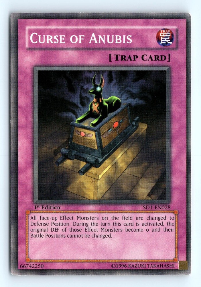 Cards 20$ or Less in Price Will be shipped in a penny sleeve and in a top loader or Semi Rigid card holder by Ebay standard envelope. Please check out the scans for a good look at the condition. This is a example of a Structure Deck: Dragon's Roar #SD1-EN028 Curse of Anubis . Please check out our other listings for more great cards.