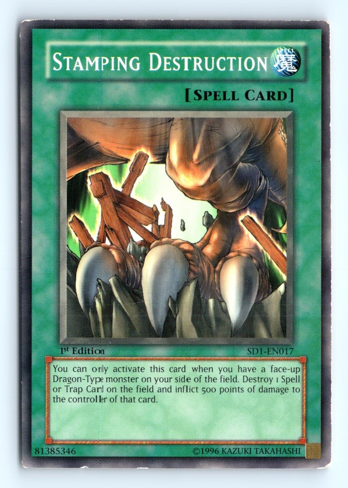 This is a nice example of a Structure Deck: Dragon's Roar #SD1-EN017 Stamping Destruction Other important information about this card: In 0 Stamping Destruction played for the . Please check out our other listings for more great cards.