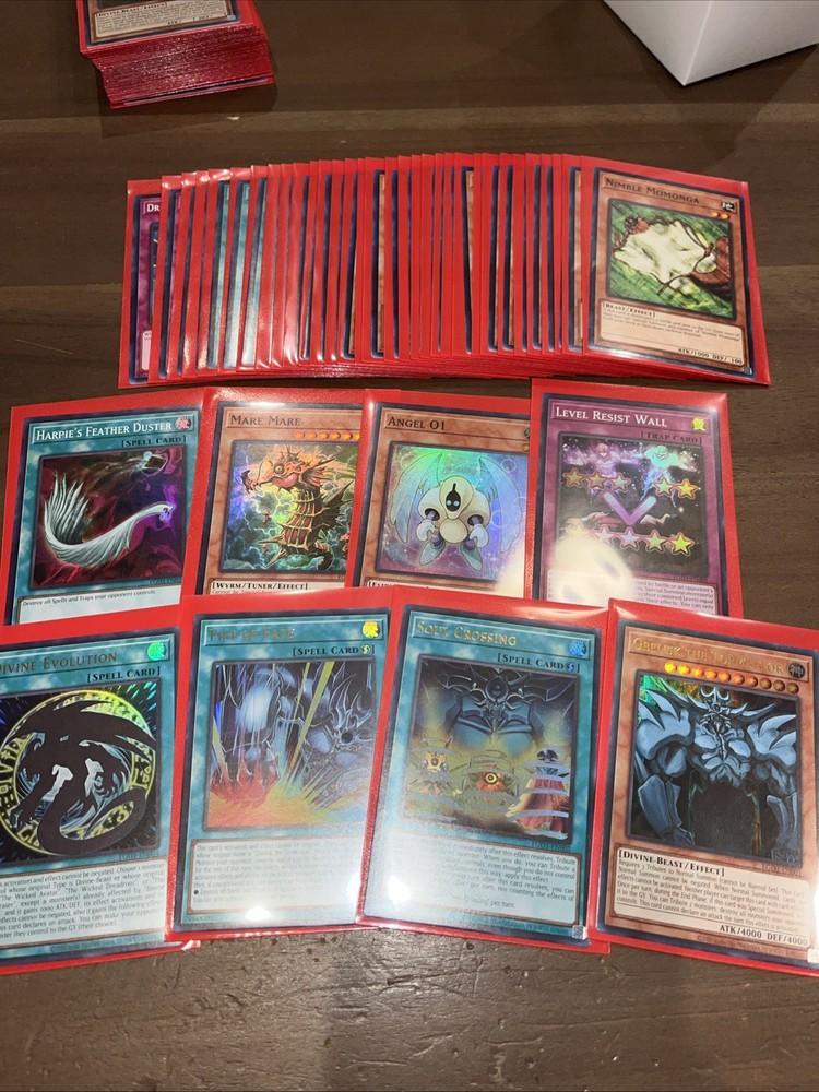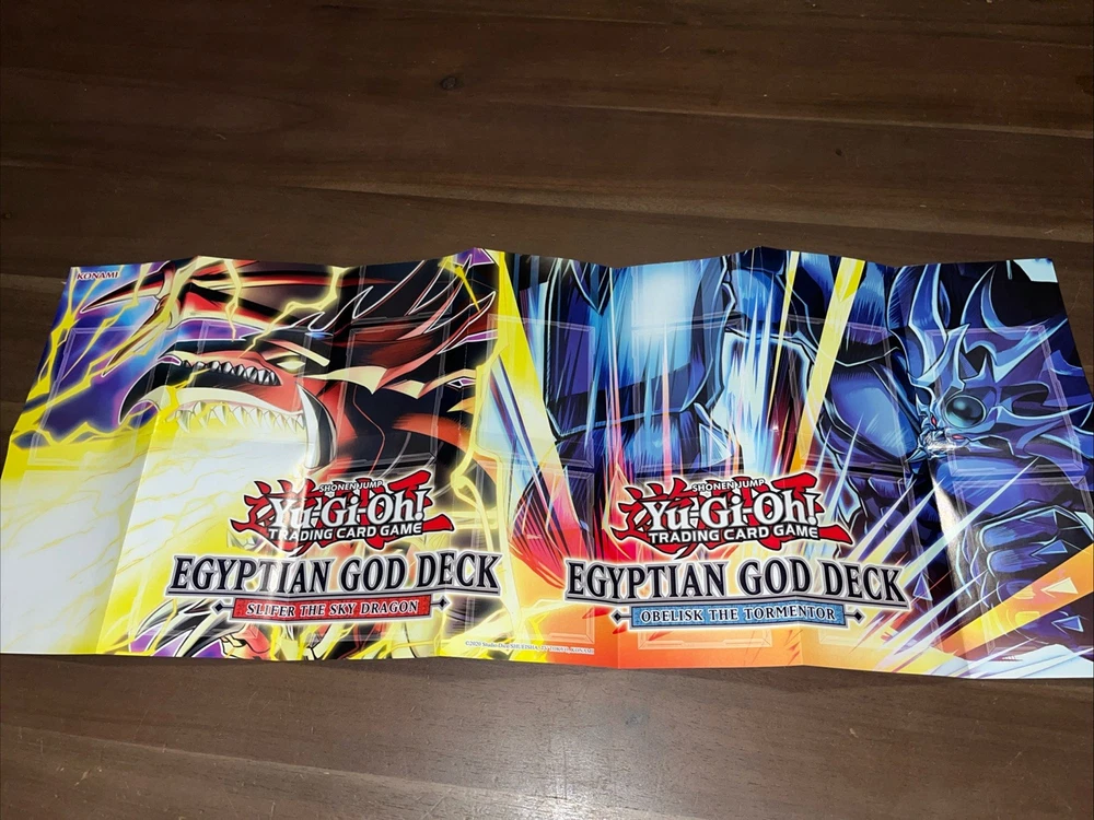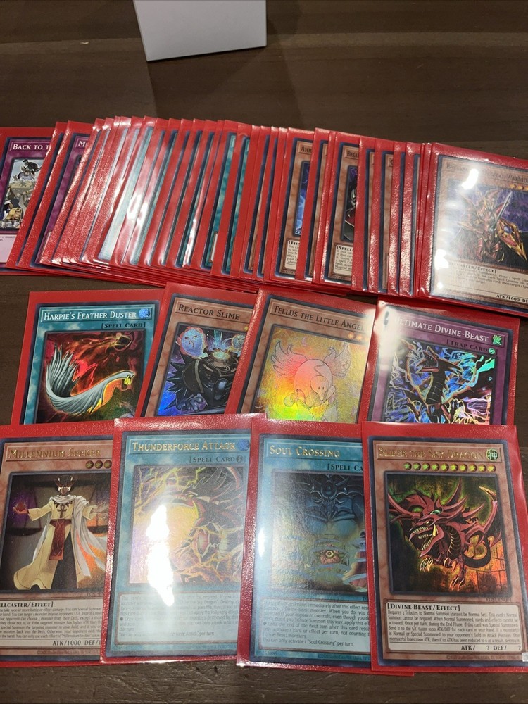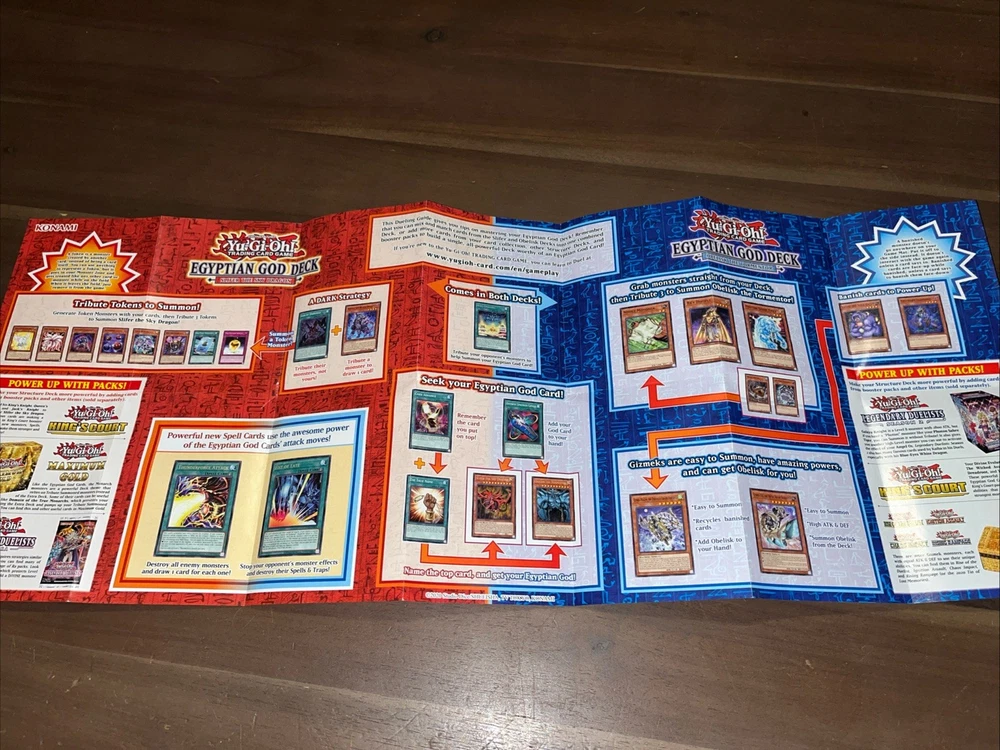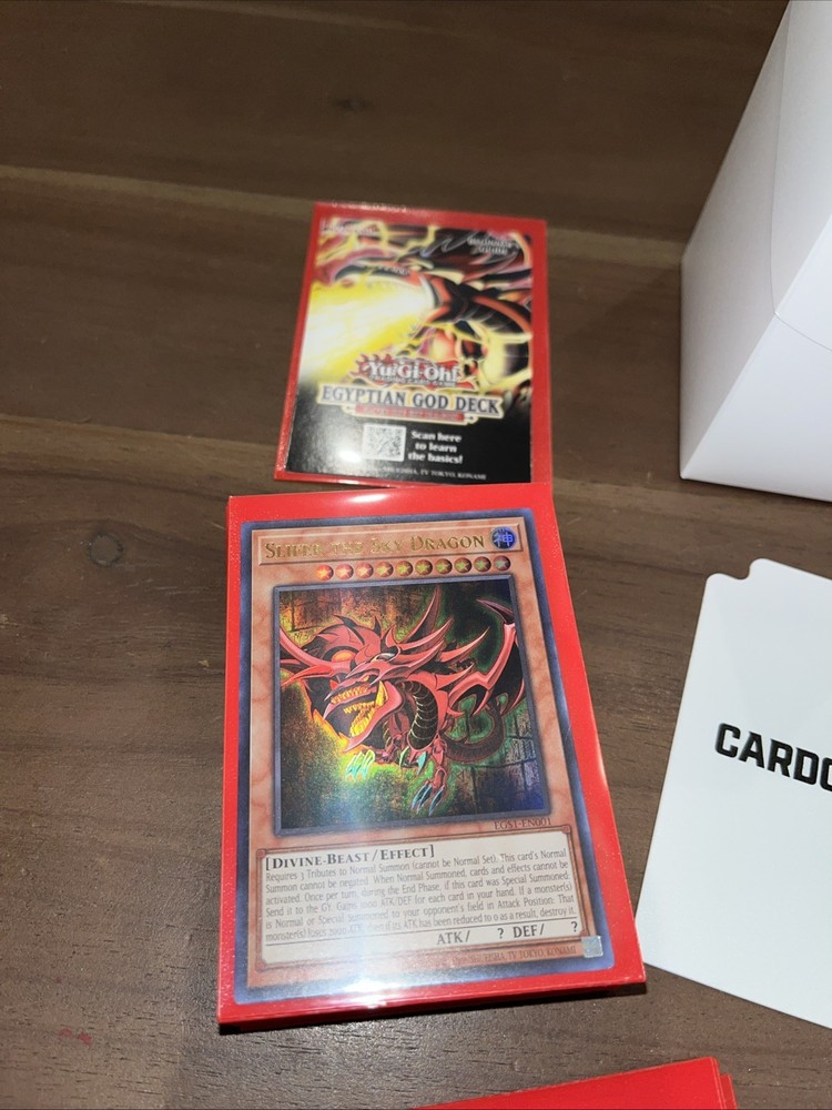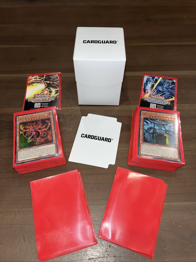 Two Yu-Gi-Oh! TCG Egyptian God God Decks, Slifer the Sky Dragon, Obelisk the Tormentor. 80 cards total, 40 per deck. Each deck has 32 common, 4 super rare and 4 ultra rare cards. All cards from factory decks included. All cards are in near mint to condition. Card Guard two deck box with deck divider. Both decks are sleeved. 100 sleeves in total. Deck mat included