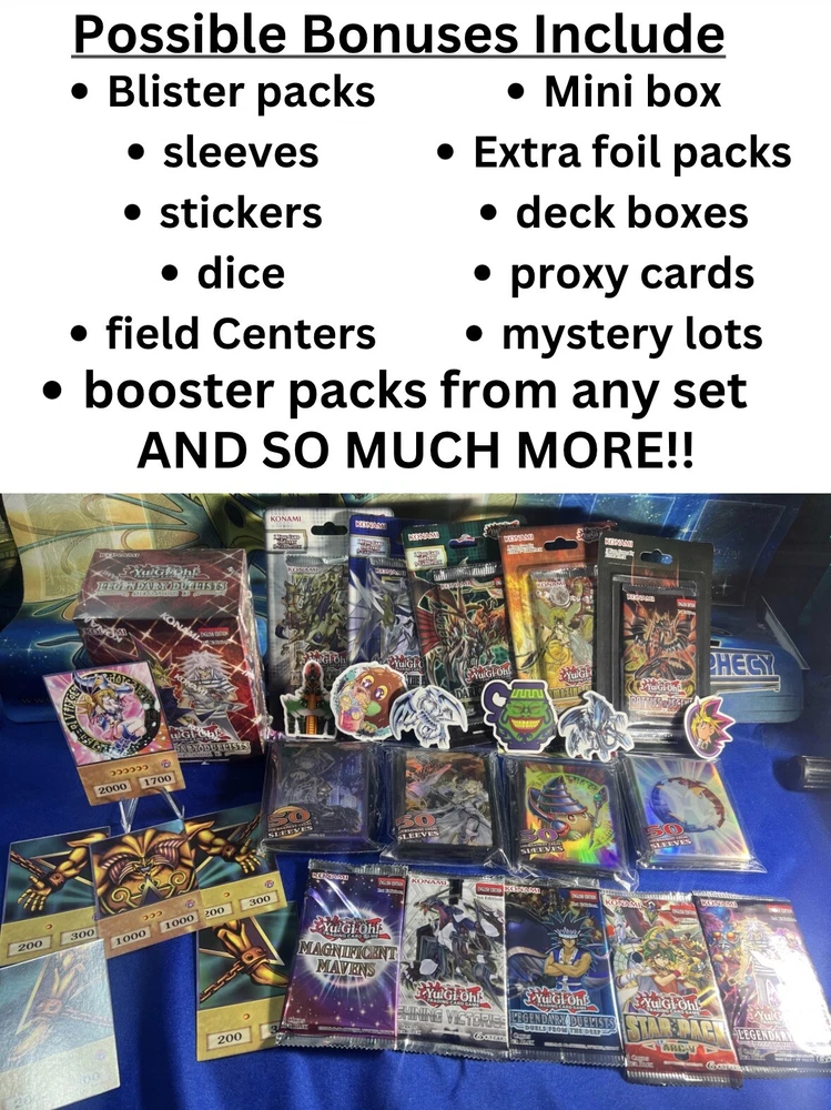 This Yu-Gi-Oh! TCG (x200-card) bulk collection lot from Konami is a great find for collectors and players alike. The Mystery Pack contains - 10 Foil cards / 30 rare Cards / 160 common cards , making it perfect for those looking to add some variety to their collection or for those who want to start playing the game. With a lot size of 200, you're sure to find some hidden gems and surprises in this randomly assorted bundle. * CARDS SHOWN ARE EXAMPLES OF WHAT YOU WILL RECEIVE - * Card lots from All sets Vintage and Modern * * includes 1st editions * * Cards in Lot are Guaranteed from at least 5 different Sets * * The cards in this bulk collection are a mixture of different types, including Ritual, Spell, Trap, Flip, Normal, Tuner, Synchro, Xyz, Effect, Pendulum, Fusion, Link, and Gemini. The pack also includes cards from different attributes, such as Earth, Water, Wind, Dark, Light, and Fire.* *possible Duplicates in a single lot order* - FREE BONUS WITH EVERY PURCHASE - *Bonus Items range in Value between 1$-20$ depending on the size of your order* Includes any of the following: -Booster Pack -Cards Sleeves -Deck Box - Proxy Cards - Blister Pack -Field Center - Extra Foil bonus pack - Stickers -Mega Packs….. and more - US BASED SELLER with shipping to all 50 states & International *International buyers responsible for any import taxes involved with purchase* - 1 day processing , Fast shipping with Tracking included, never wait to know when you will receive your purchase - ALL Items packaged and shipped with care Please check out the other items in my store. Disclaimer: We offer free refunds on items in original shipped condition with any additional bonus items included in the return. If deemed tampered with, opened, buyers remorse, misused or substituted, we reserve the right to deny returns under EBay’s return policy. Please have tracking and order# available upon inquiry and do contact us if any issue arises.