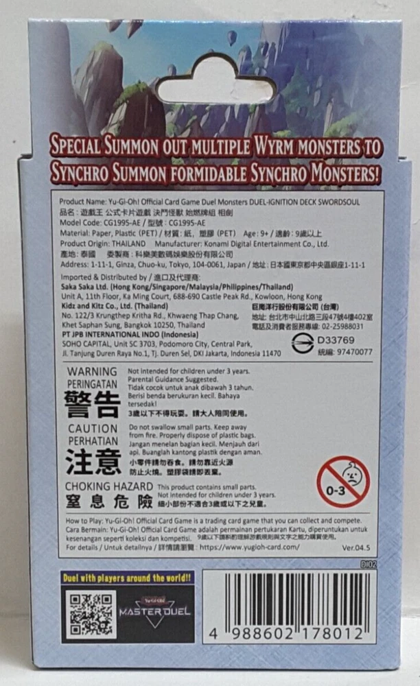 Buying Instruction – Must Read You are now buying: I) Product Description - Yugioh Asia English Duel-Ignition Deck: Swordsoul DI02 New Sealed II) Shipping (By Registered Post)-International/Local (DHL eCommerce or equivalent for international shipping) - 1 st Item = $22.00(Int), $22.00(local), additional set is = $18.00 per set III) Tracking number will be provided. IV) Packaging Method - The card will be insert into a sleeve and put into a top loader and put in a bubble envelope. V) Stock Availability - All items are in stock at the time of listing. - In the case of the stock being unavailable due to unforeseen circumstances, you will be able to refund. International Buyers – Please Note: Import duties, taxes, and charges are not included in the item price or shipping cost. These charges are the buyer's responsibility. Please check with your country's customs office to determine what these additional costs will be prior to bidding or buying. Powered by SoldEazy