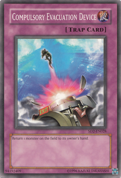 Yugioh! Card Listing Yugioh Compulsory Evacuation Device SD2-EN028 Common Unl Ed VLP For any questions or concerns, please contact me and I will address them ASAP. Condition Grading NM / Near Mint - Minimal to no wear; no noticeable bends/rips/folds/edge wear; signs of shuffling/normal use. LP / Lightly Played - May have slight indication of damage, such as a small bend/crease or edge wear. HP / Heavily Played - Significant signs of damage, such as numerous bends across the card or peeling at the edges. Shipping and Handling Orders ship out within 2-3 business days of payment being received, often within 1 business day. All cards are securely sealed inside sleeve + top-loader. Please contact me to arrange for combined shipping. Domestic eBay Standard Envelope: ~3-7 days, white envelope w/ tracking, default for orders under $20. USPS Ground Advantage: ~2-5 days, bubble envelope, required for orders over $20, tracked/insured. USPS Priority Mail: ~1-3 days, bubble envelope, tracked/insured. International Based on location/weight, sent in bubble envelope w/ tracking. BUYER IS RESPONSIBLE FOR ALL CUSTOMS AND IMPORT DUTIES/TAXES/CHARGES Please give international orders at least 4-8 weeks to arrive! Customs is very slow, and international shipping can often take longer than expected, especially with any shipping service slower than Priority Mail Express. Feedback If what you receive is not as described, please contact me within 3 days of receipt to resolve the issue. Please leave positive 5* feedback if you are satisfied. For anything else, please contact me first (before leaving feedback!) through eBay messaging. Thank you for looking, good luck! ~ A Trove of Mythical Treasures ~
