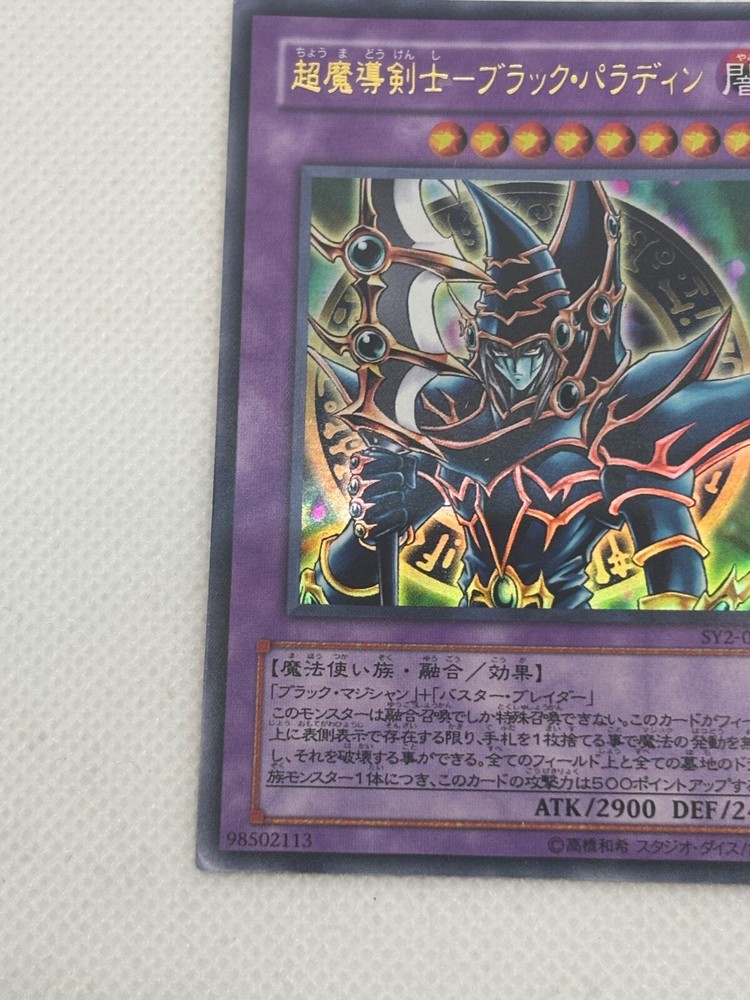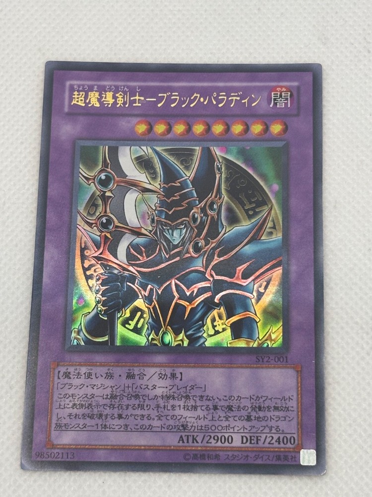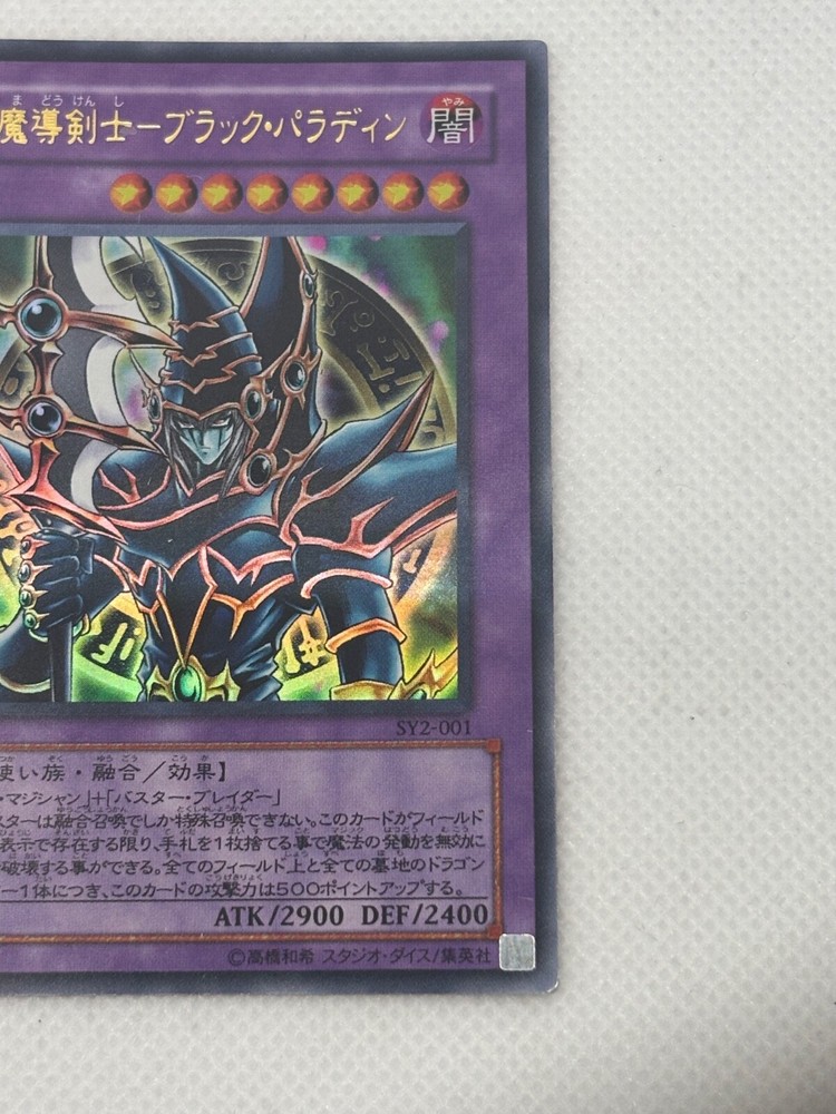 The product is a Yu-Gi-Oh! TCG card named "Dark Paladin" from the "starter deck yugi" set featuring characters Yami Yugi and Yugi Muto. It is a Fusion card of the Creature/Monster Type Spellcaster with the Attribute Darkness. This Ultra Rare card was manufactured by Konami in 2001 and is in Japanese language with a foil finish. The card number is SY2-001 and it is part of a Structure Deck, making it a valuable addition to any Yu-Gi-Oh! card collection.