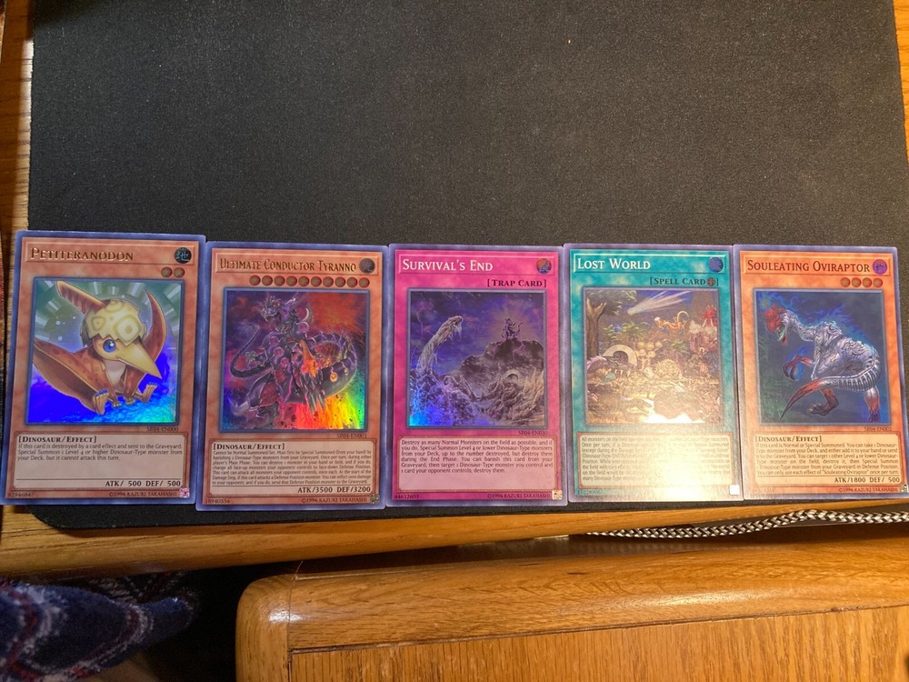 Yugioh Dinomasher's Fury Structure Deck Holos - 5 car set - NM - Unlimited This is a 5-card set of all the holos from the Dinomasher's Fury structure deck. All are in NM condition and unlimited. You are bidding/buying five (5) cards. If you would like additional pictures, just ask. _________________________________________________________________________________________________________ Please check out my other listing @ http://www.ebay.com/usr/lechung88 I ship all cards in a penny sleeve put into a top-loader and put into a standard envelope. If you have any question or concerns, please feel free to send me a personal message using the e-bay system. Thanks! !NO INTERNATIONAL SHIPPING OR SALES! (Including Canada)