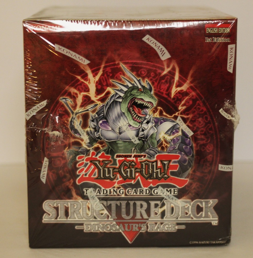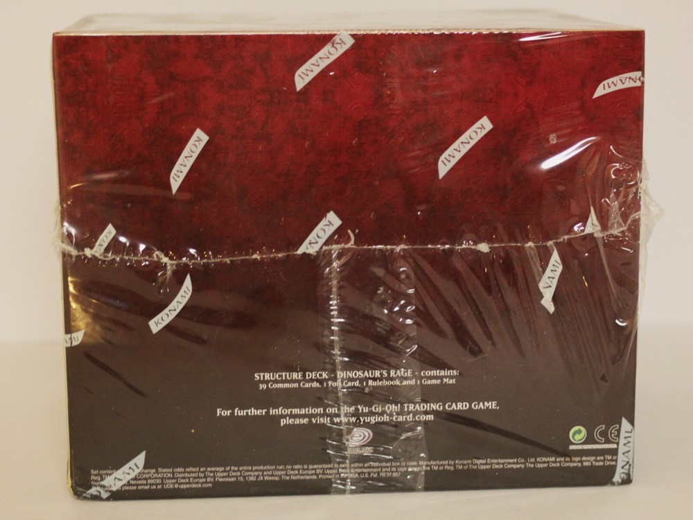 Factory Sealed - Structure Deck: Dinosaurs Rage 1st Ed Display (8 Total Decks) Images are of actual item to be shipping. Stored in a smoke free, pet free environment. Each Structure Deck - Dinosuar's Rage - Contains: 39 Common Cards, 1 Foil Card, 1 Rulebook and 1 Game Mat
