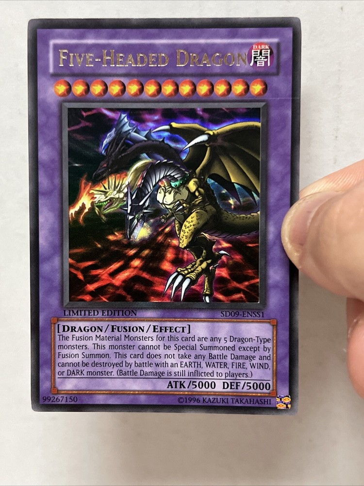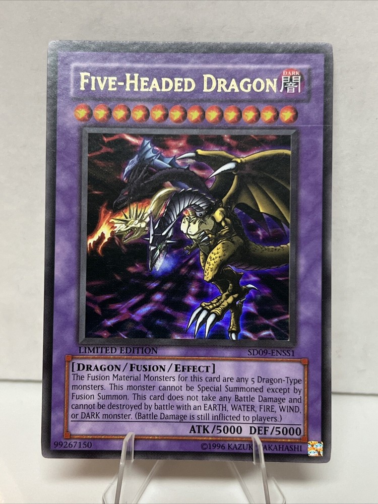 Elevate your Yu-Gi-Oh! TCG collection with the formidable Five-Headed Dragon, card number SD09-ENSS1. This Ultra Rare Fusion card boasts a stunning Holo finish that's sure to catch the eye of both players and collectors alike. A must-have for any serious Yu-Gi-Oh! enthusiast, this card features the powerful Dragon creature/monster type, adding a significant edge to your gameplay. Crafted by Konami, the Five-Headed Dragon card is a limited edition gem that stands out in any collection. Whether you're looking to enhance your deck's performance or seeking a prized piece for your display, this card's unique blend of rarity and design makes it an exceptional find. Add it to your arsenal and feel the might of the Five-Headed Dragon at your next duel.
