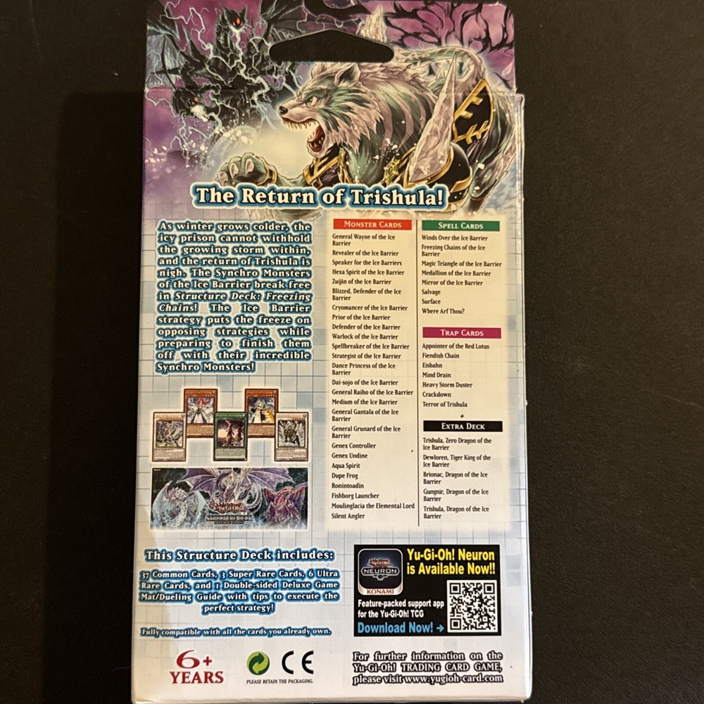 The product is a Yu-Gi-Oh! TCG Structure Deck titled "Freezing Chains" in English, first edition, manufactured by Konami in 2021. It features a deck based on the TV show Yu-Gi-Oh! and includes cards for play. The deck is sealed and ready for use.