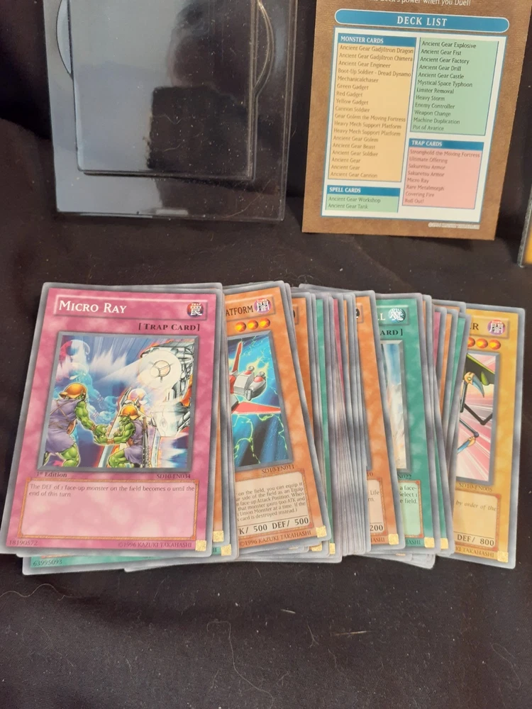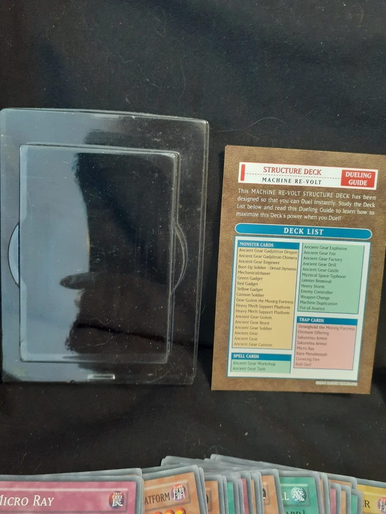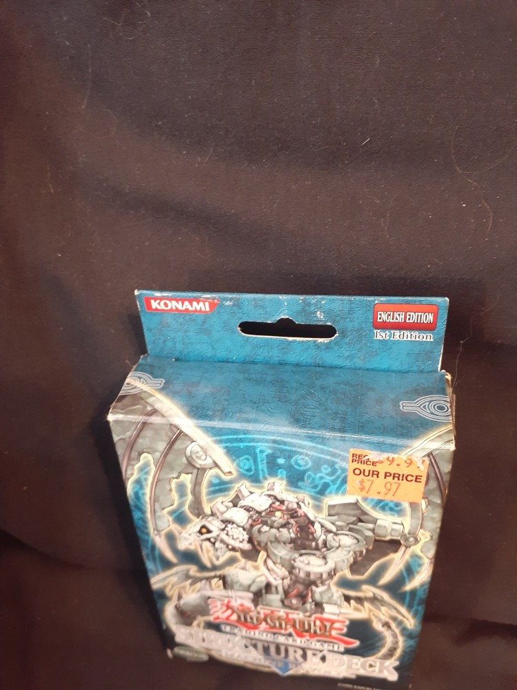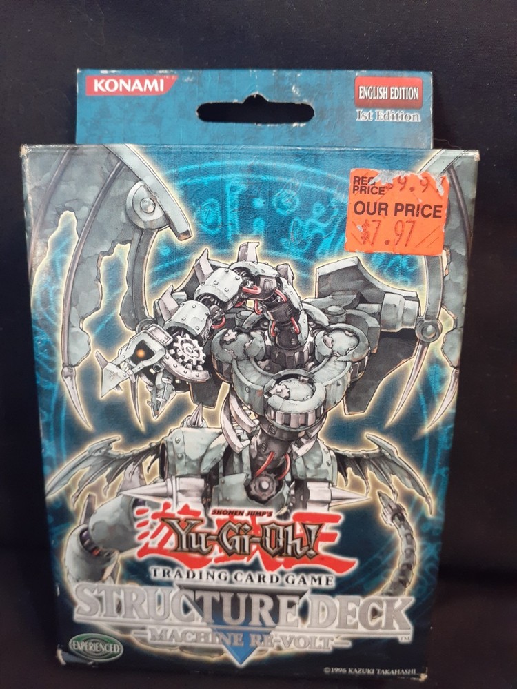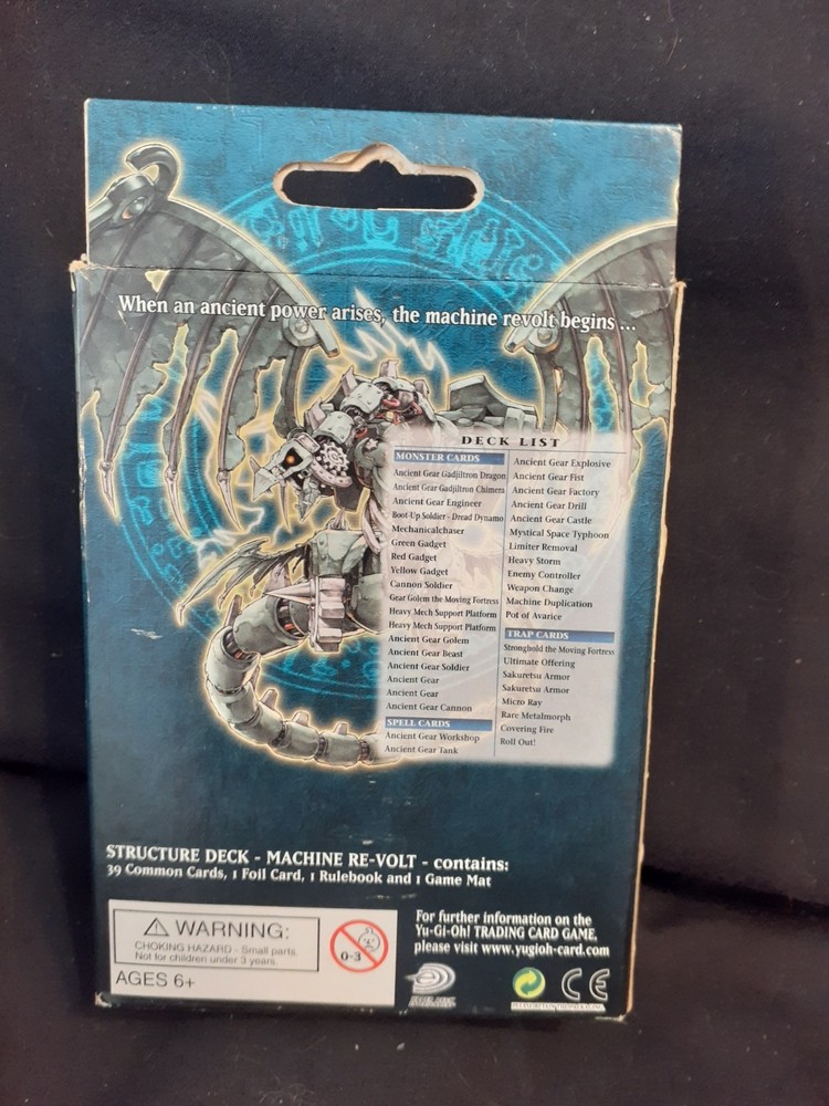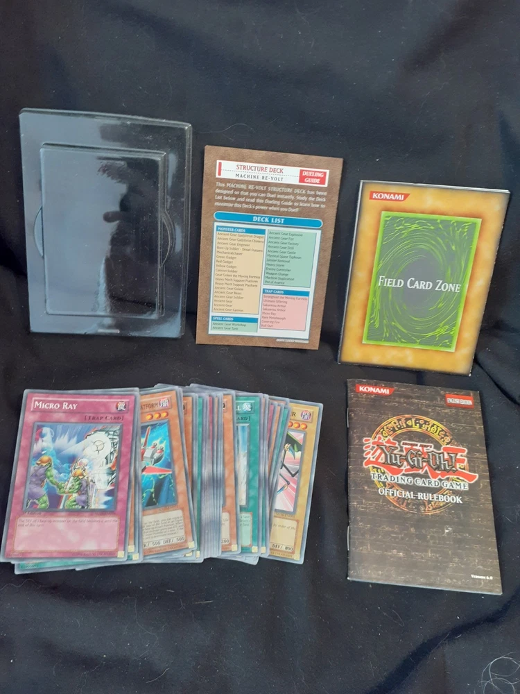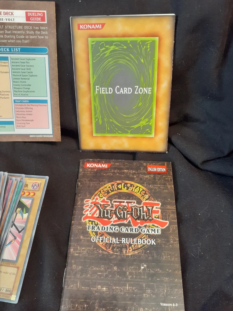 Yugioh! MACHINE RE-VOLT Structure Deck. Listing consists of open container box, Official Rule Book, Field Card Zone, Dueling Guide & estimated 25-30 assorted loose cards. All appears in very good condition, box shows minor wear from use. Has original price tag on front of box. See photos for best condition and valuation of this lot. An estate auction purchase of a boxlot full of assorted trading cards. We are not collectors of this type item. Price at what we see from other similar ebay listings. We invite offers and we combine SHIPPING on multi-item purchases. We refund OVERPAYMENT on shipping within 4 days of purchase.