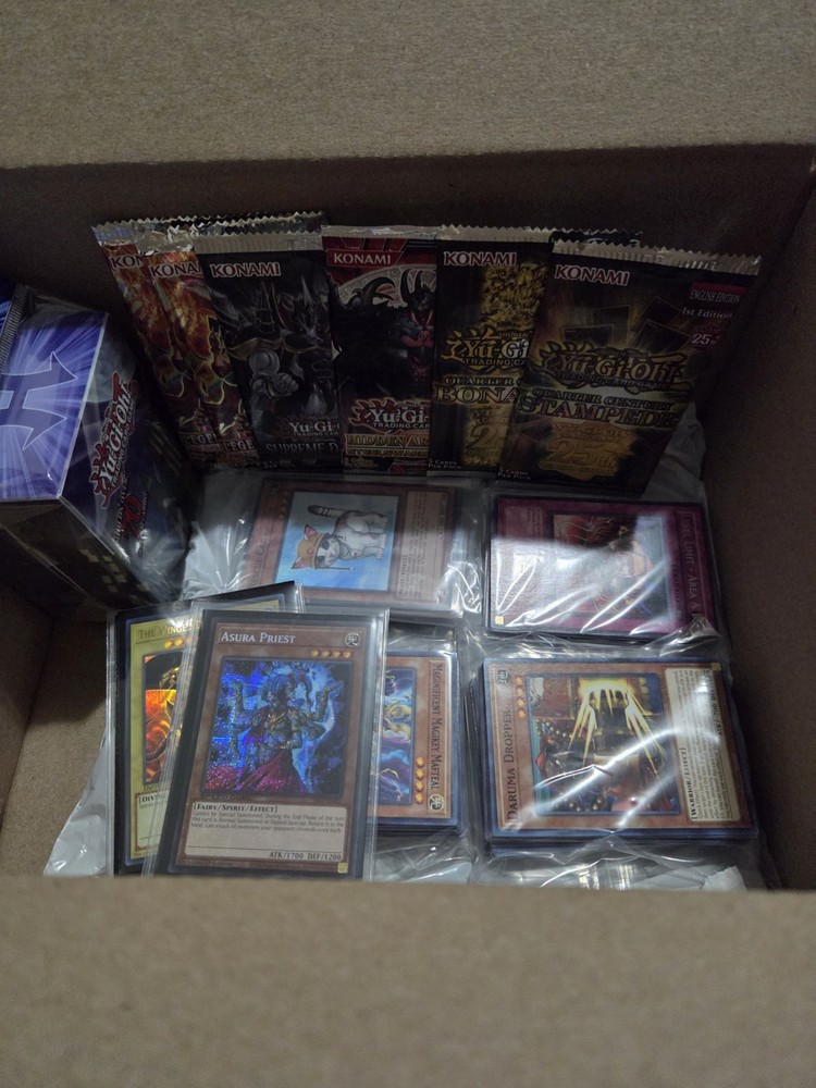 Each box will contain; -1 bonanza pack -1 stampede pack -2 legendary duelist packs -1 random pack -1 pack supreme darkness/retro pack 2024/ or a metal raiders 25th anniversary pack -120 common cards -30 higher than common -1 platinum secret Rare -1 either ultimate Rare or collectors rare *One box will contain blue-eyes white destiny structure deck 8% chance *3 boxes will contain a graded card 25% chance *Gem mint 10 box will not contain bonanza and stampede 12 total mystery boxes made. Once purchased you may message me a number 1-12 to correspond with the boxes