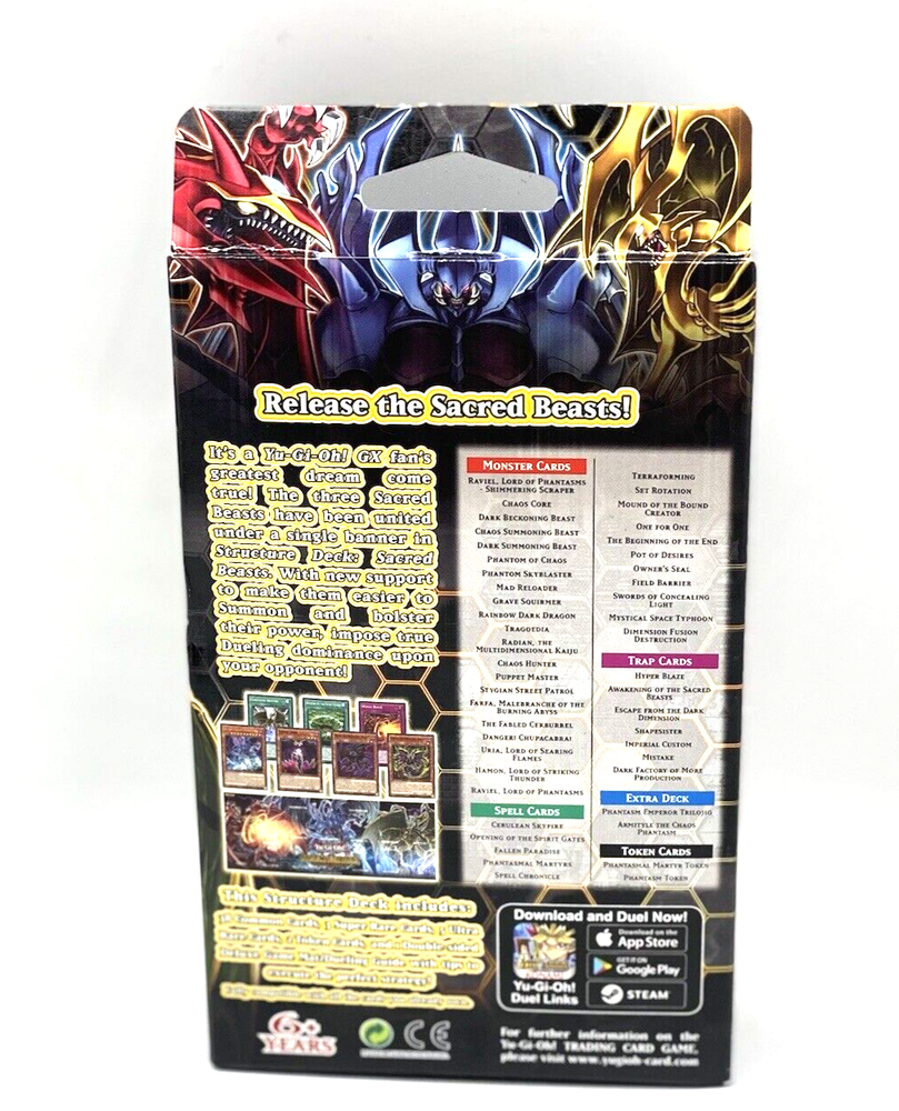 Brand New Sacred Beasts Structure Deck ( 1st Edition ) Limited Rare! Each Structure Deck: Sacred Beasts contains 46 cards total (44-card Main Deck, 2-card Extra Deck) as well as 2 different Token Cards: 5 Ultra Rares 3 Super Rares 38 Commons 2 Token Cards 1 Double-sided Deluxe Game Mat/Dueling Guide (Item will be Shipped Quickly, Safely and Secured. Please feel free to reach out for any questions.)