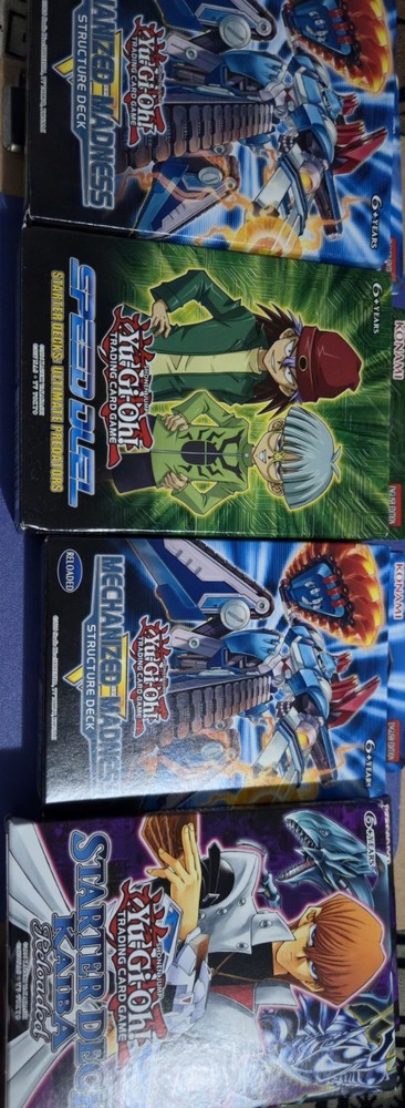 This lot contains 2 mechanized madness structure decks. One of them has lost the factory sealing glue halfway. This lot also contains speed duel ultimate predators starter deck and starter deck kaiba reloaded. All of these decks have some whitening on the corners due to being older decks. However, the products are sealed and new. The lot comes with 10 factory sealed booster packs. And also 100 random cards for free. 3 flames of destruction 2 dark saviors 2 duelist pack kaiba unlimited And 3 duelist packs, Yugi unlimited Please let me know if you have any questions.
