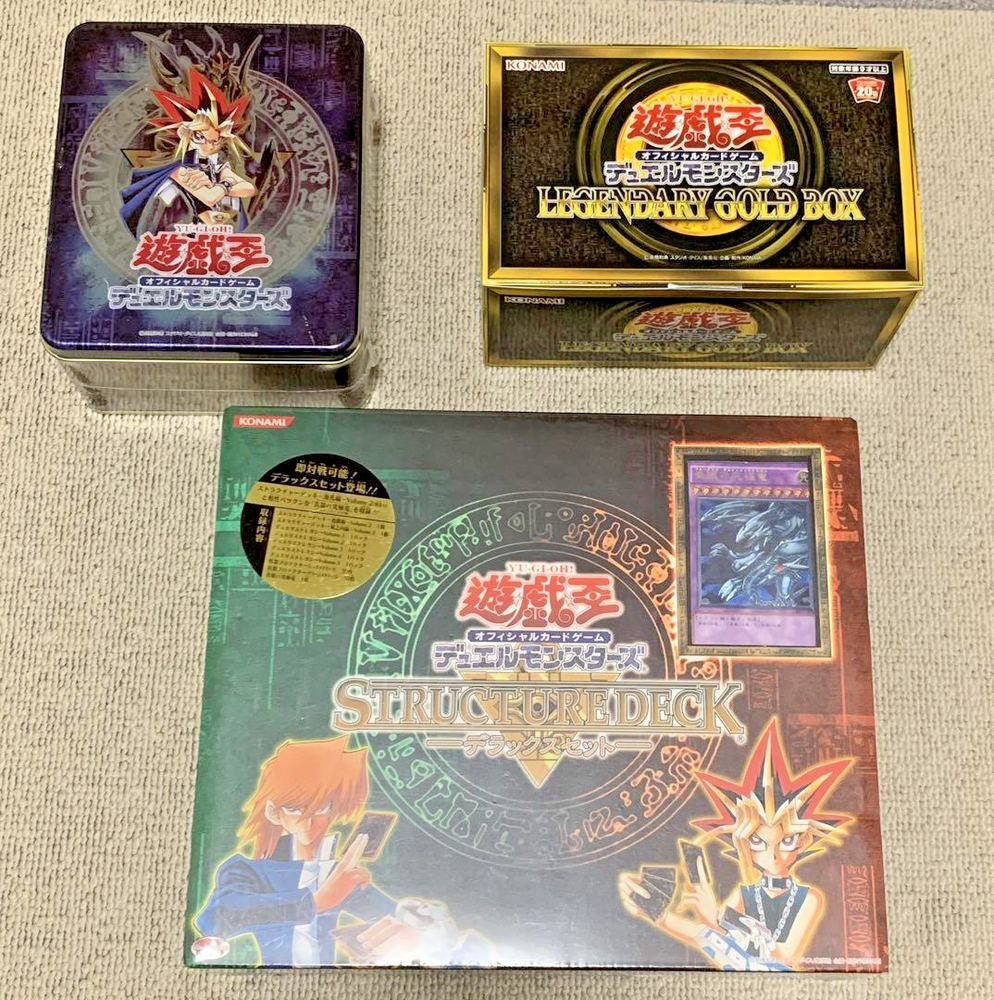 * Description All my products are 100% Authentic. Please feel free to contact us if you have any question. * Shipping We ship using FedEx, DHL and Japan Post. * Payment We usually ship within 5~10 business days of receiving cleared payment. * International Buyers - Please Note: Import duties, taxes and charges are not included in the item price or shipping charges.These charges are the buyers responsibility.Please check with your countrys customs office to determine what these additional costs will be prior to bidding/buying. These charges are normally collected by the delivering freight (shipping) company or when you pick the item up do not confuse them for additional shipping charges. I do not mark merchandise values below value or mark items as "gifts" - US and International government regulations prohibit such behavior. Yu-Gi-Oh Official Card Game Duel Monsters Collectible: 3-piece set Set Contents tin can 2004 LEGENDARY GOLDEN BOX STRUCTURE DECK Deluxe Set All were purchased by family members at the time of release and stored in a dark place for a long time. Condition Tin can 2004 Shrink-wrapped, but there are some scratches on the surface. (See 2nd image). LEGENDARY GOLDEN BOX Shrink-wrapped and in good condition. STRUCTURE DECK Deluxe Set There are some small holes on the back side of the shrink, but they seem to be from the initial condition. (See 3rd image) About the condition of the cards Due to many years of storage, we do not know the details of the fading of the cards. Please see the fourth image for condition. Notes. The can and golden box are only photographed from above due to the contents moving. Please do not purchase if you are nervous or expect them to be in perfect condition. Recommendations This item is recommended for collectors as it includes a shrink-wrapped item! This is a rare set that offers a nostalgic experience of the time when it was first released.