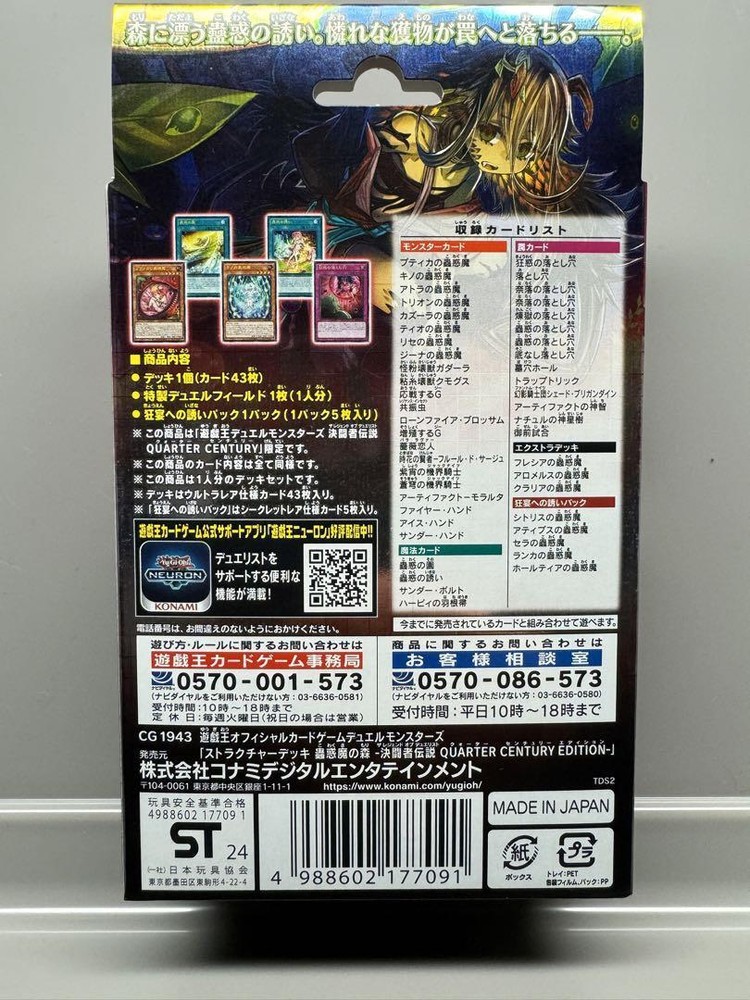 Yugioh Structure Deck Forest of the Traptrix Quarter Century Edition Box Description Condition: New Yu-Gi-Oh! Structure Deck Bug and Demon Forest - Legend of Duels: Quarter CENTURY EDITION Payment Please pay within 5 days after the auction closed. Shipping -The costs differ according to your area. Please check the shipping tab. -We can ship ONLY to your ebay address. -Please choose shipping as follows. (1)Expedited Shipping (tracked & insured)(5-7 days) (2)Standard Shipping (tracked & no insured)(10-21 days) -We can combine shipments for multiple items purchased to save postage. -If there is a remote charge for your address, we will charge for additional shipping. Returns Returns are accepted ONLY if the item was not the item described. International Buyers - Please Note: * Import duties, taxes and charges are not included in the item price or shipping charges. These charges are the buyer's responsibility. * Please check with your country's customs office to determine what these additional costs will be prior to bidding/buying. * These charges are normally collected by the delivering freight (shipping) company or when you pick the item up - do not confuse them for additional shipping charges. * We do not mark merchandise values below value or mark items as "gifts" - US and International government regulations prohibit such behavior.