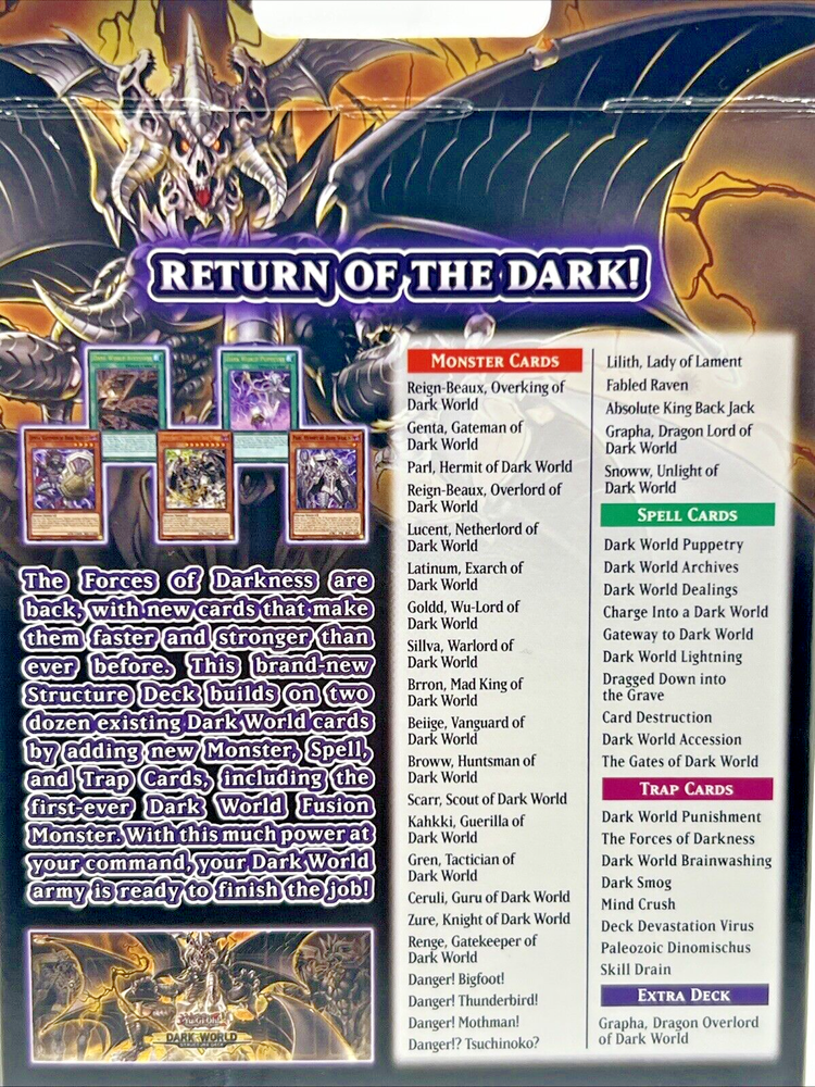 Listing includes 1 sealed Dark World Structure Deck. 37 common cards, 5 ultra rare cards, and 3 super rare cards. Take control of fiendish monsters and unleash the power of the Dark World....