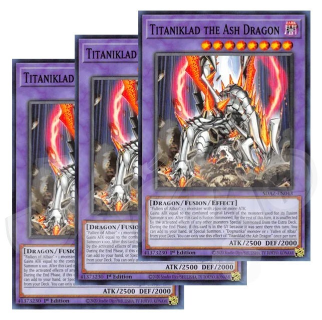 Titaniklad the Ash Dragon x 3 1st Edition The cards are in NM condition. Also will include a free Holographic card which can be a rarity of Super, Ultra, Secret, etc! Card Information "Fallen of Albaz" + 1 monster with 2500 or more ATK Gains ATK equal to the combined original Levels of the monsters used for its Fusion Summon x 100. After this card is Fusion Summoned, for the rest of this turn, it is unaffected by the activated effects of any other monsters Special Summoned from the Extra Deck. During the End Phase, if this card is in the GY because it was sent there this turn: You can add to your hand, or Special Summon, 1 "Fallen of Albaz" or "Dogmatika" monster from your Deck. You can only use this effect of "Titaniklad the Ash Dragon" once per turn. Number: SDAZ-EN043 Rarity: Common
