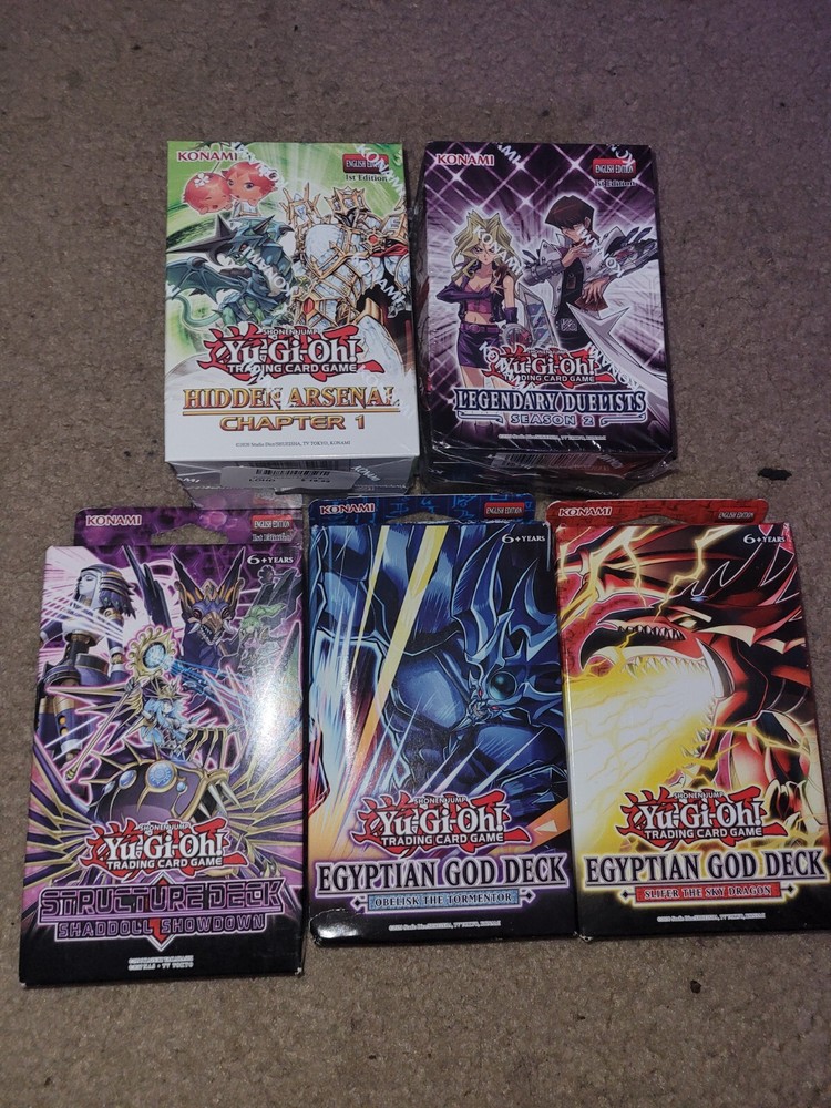 Yugioh structure deck bundle. Included, - Shaddoll showdown : Structure deck - Obelisk the tormentor : Structure deck -Slifer the sky dragon : Structure deck - Hidden Arsenal Chapter 1 - Legendary duelists Season 2
