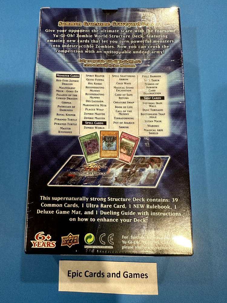 You are bidding on : 1 x Yu-Gi-Oh 2008 ZOMBIE WORLD - 5D'S Structure Deck - (1st Edition) In Stock and ready to ship. ZOMBIE WORLD Structure Deck Contains: 39 Common Cards 1 Ultra Rare Card 1 Rulebook 1 Game Mat 1 Dueling Guide Condition: Brand new and unopened Excellent condition. Picture show exactly the one you are getting. Payment is due within 5 days of the end of this auction. (If we don't have an item in stock due to inventory problems etc, we will refund your payment immediately, please understand these things happen and we try our best to make sure they don’t but mistakes can happen.) Shipping : Handling time: 1 - 3 days *“Business days” are normal weekdays. Saturdays, Sundays, and major holidays do not count as business days. Expedited within Canada Canada Post or USPS Tracked Package to the USA $9.99 per deck. Additional deck please add $2.99 each. Epic Cards and Games Any questions feel free to email us and allow 1 day for a response. Thanks for looking! Sales Tax (Canada Only) : Purchases made by Canadian residents are subject to applicable GST/HST, depending on your province/territory. (If you do not agree to this, please do not bid. We have a registered business in Canada and are required by law to charge taxes to anything shipped within the country.) Thank you for shopping with Epic Cards and Games