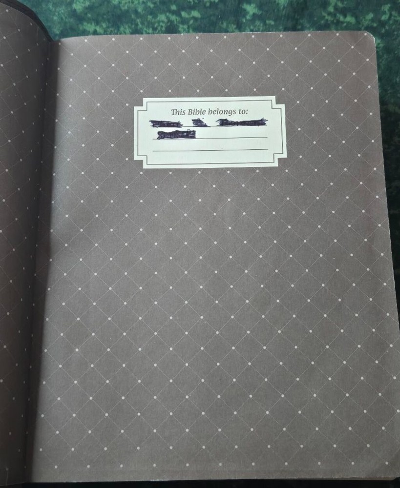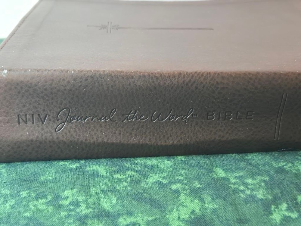 This is a pre-owned NIV Journal the Word Bible by Zondervan. The cover is a brown, textured soft leather material with an embossed cross design. The spine reads "NIV Journal the Word BIBLE". The interior pages are clean with some highlighted/underlined text. The inside cover has a filled-in "This Bible belongs to:" label. It includes a brown ribbon bookmark. The overall condition shows gentle use.
