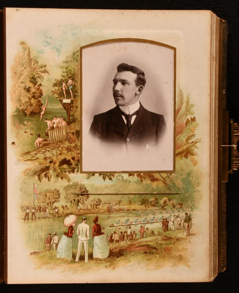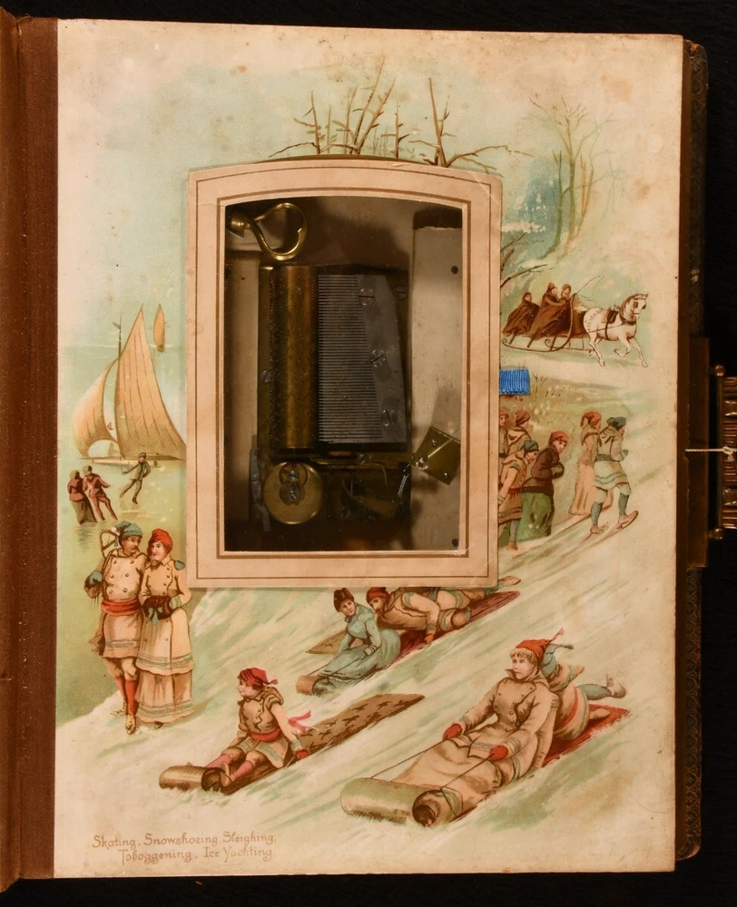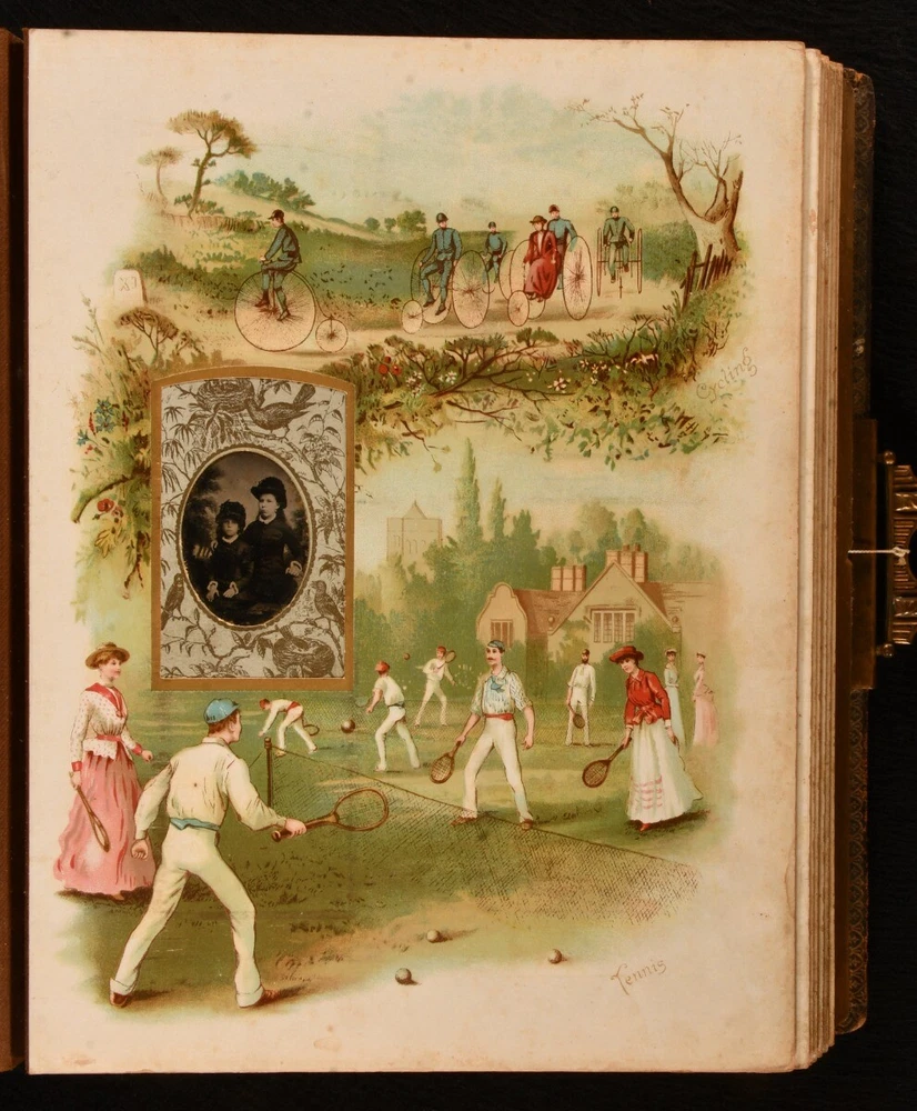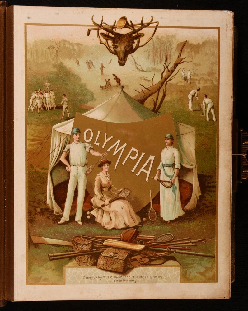 Click here to see our other books! Olympia Not Stated c1890 W. H. S. Thompson, H. Burnett, & Others : Germany 12" by 9" Unpaginated SUMMARY A very scarce Victorian German photo album and music box, an exceptional and unique work. Colour Plates,Illustrated,Leather Binding,Publishers' Original Binding,Very Scarce Overall Condition: Very Good This book weighs 5 KG when packed UK Postage: £ 4.49 US Postage: £ 42.99 EU Postage : £ 27.99 European Postage: £ 45.99 Asia Postage: £ 74.99 Worldwide Postage: £ 129.99 DESCRIPTION A very scarce and unique German made photo album, complete with a music box. The album is highlighted throughout with vivid chromolithographs, which depicts scenes of tennis, baseball, football, cricket, skiing, and more. Illustrated with a total of eleven striking chromolithographs. This beautiful album contains fifty-seven mounted photographs, and two photographs loosely inserted. The music box is fully operational, a comb and cylinder device mounted in the rear paste down. Including the original key, which can be inserted into a winding hole to the rear board. The music box is now operated by a string attached to the brass clasp, which can be pulled to play the song. One mounted photograph has the names Evelyn and Kathleen Richardson in pencil. CONDITION In a full morocco binding, rebacked with the original embossed boards restores. Externally, generally smart, with light fading and rubbing to the boards, rubbing a little heavier to the extremities. Minor bumping to the extremities. Small bookplate to the front paste down. Internally, firmly bound. Pages are bright and generally clean with some spots. A few very small closed tears to the leaves, with small tape repairs. Photographs are generally bright with some fading and spots. Overall Condition: Very Good GLOSSARY OF TERMS Overall Condition (Dustwrapper condition rating is shown after that for the book itself, where a dustwrapper is present) Fine - Very well preserved copy showing very little wear Very Good Indeed - Only one or two minor faults, really a very attractive copy Very Good - Quite a wide term meaning no major faults but probably several smaller ones often expected given the age of the book, but still a respectable copy Good - Meaning not very good. Some more serious faults as will be described in the condition report under 'condition' Good Only - Meaning one or more faults that could really do with repair Fair - As with good only above but with other faults leaving a compromised copy even after repair Poor - Really bad and possibly seriously incomplete. We only sell books in this condition where their rarity or value makes them attractive none the less. Major defects will be described. GUARANTEE We offer a full money back guarantee on our descriptions. Please ask for details and conditions. We prefer PAYPAL. If you pay via PAYPAL we will post the item off the same or the next working day with the postage you have selected. Please note we cannot accept USD cheques
